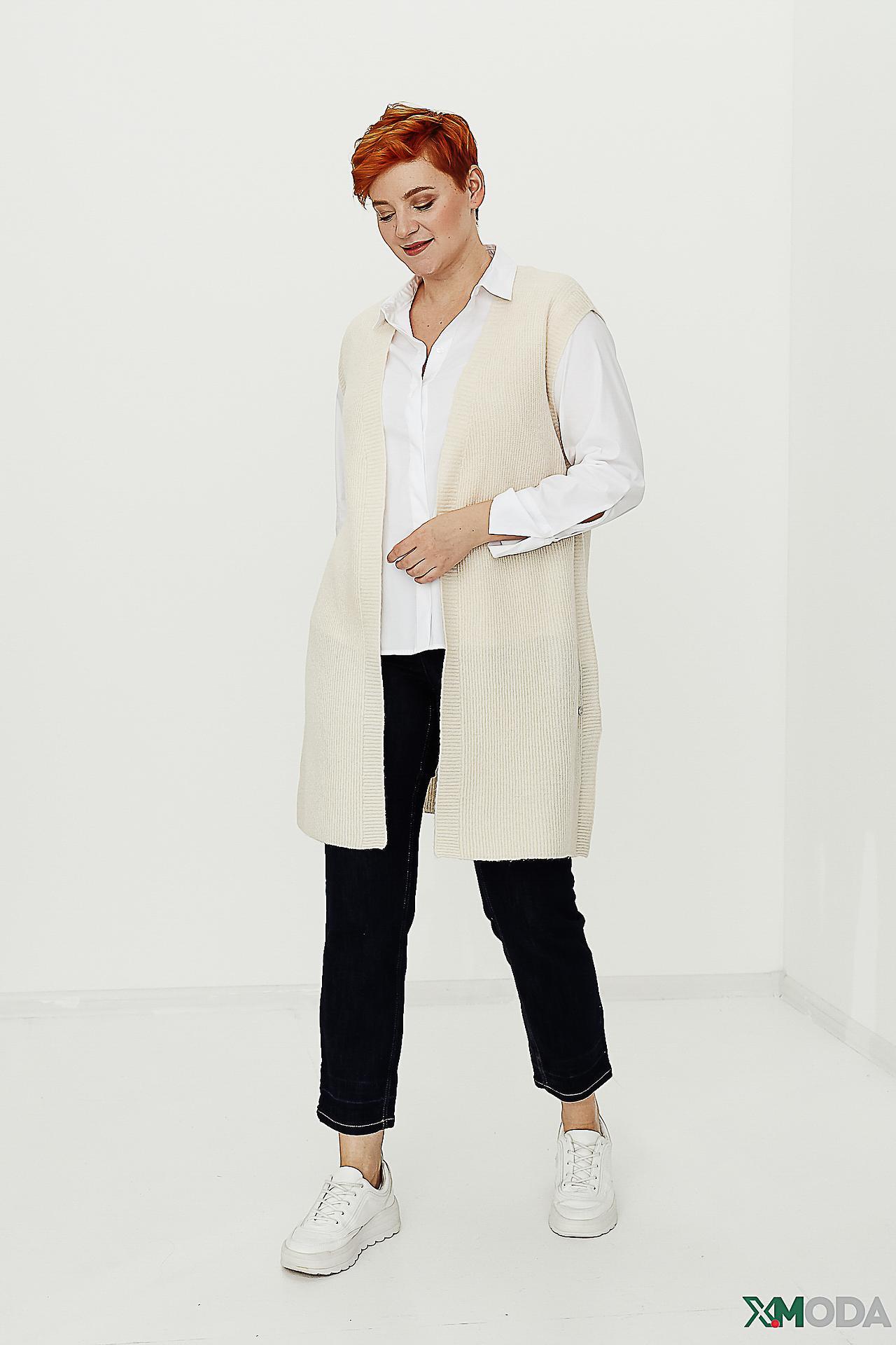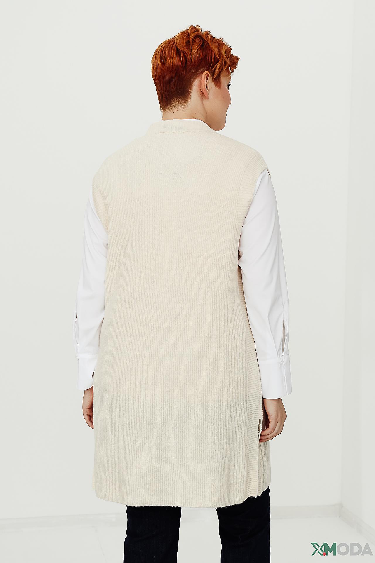 - Крой: Прямой удлиненный силуэт жилета подходит для большинства типов фигур, визуально вытягивая силуэт и придавая образу элегантность. Отсутствие застежек добавляет модели легкости и непринужденности.