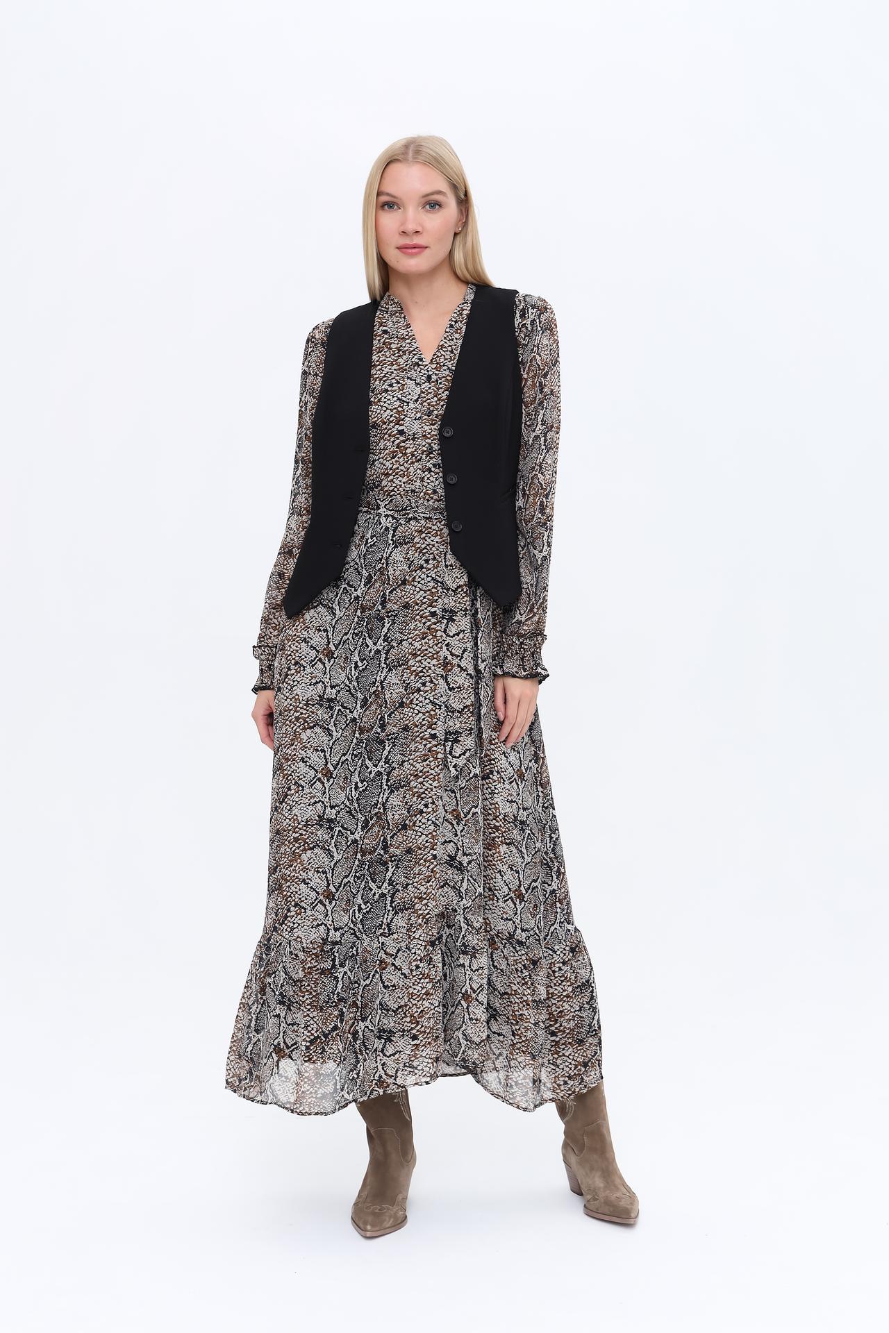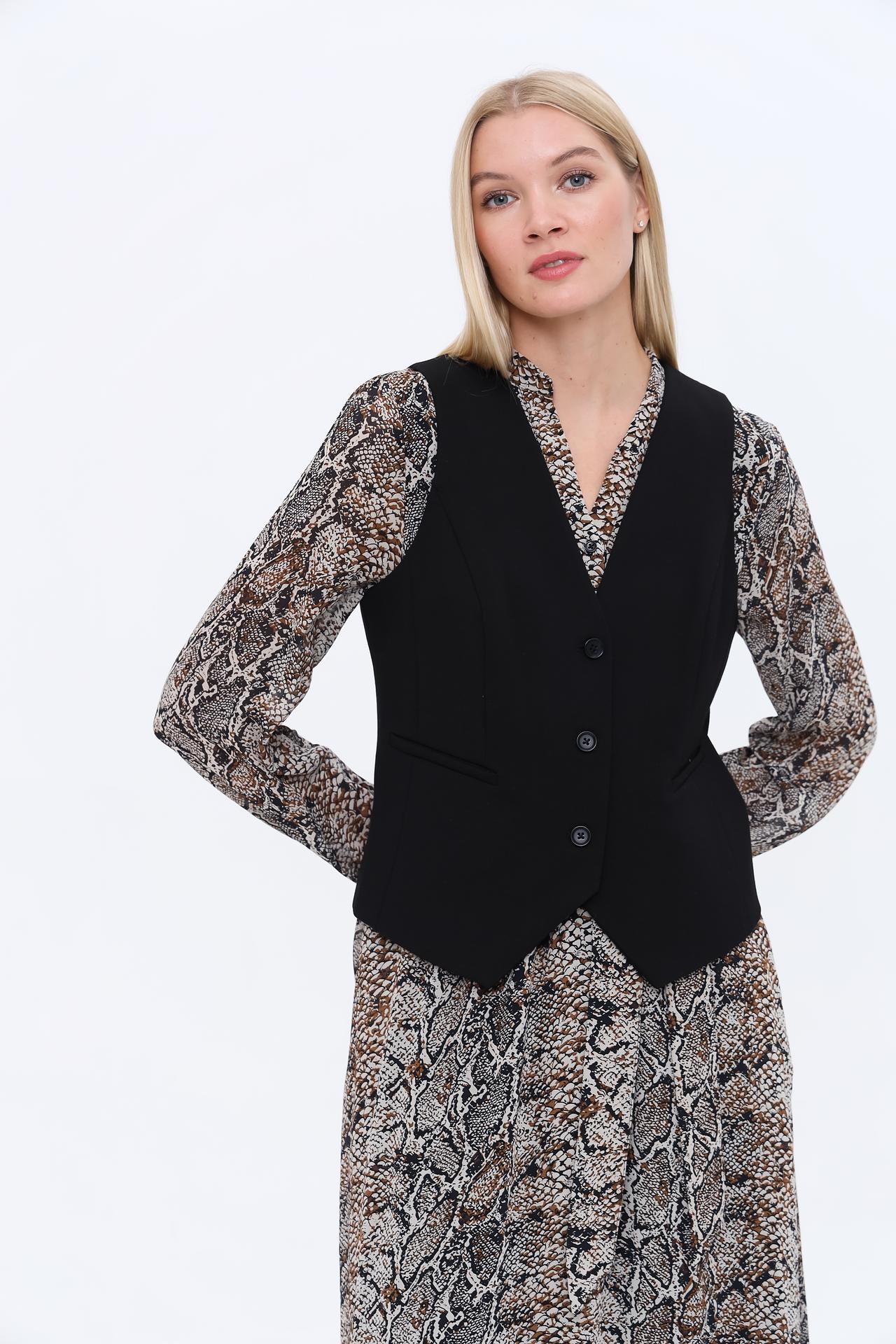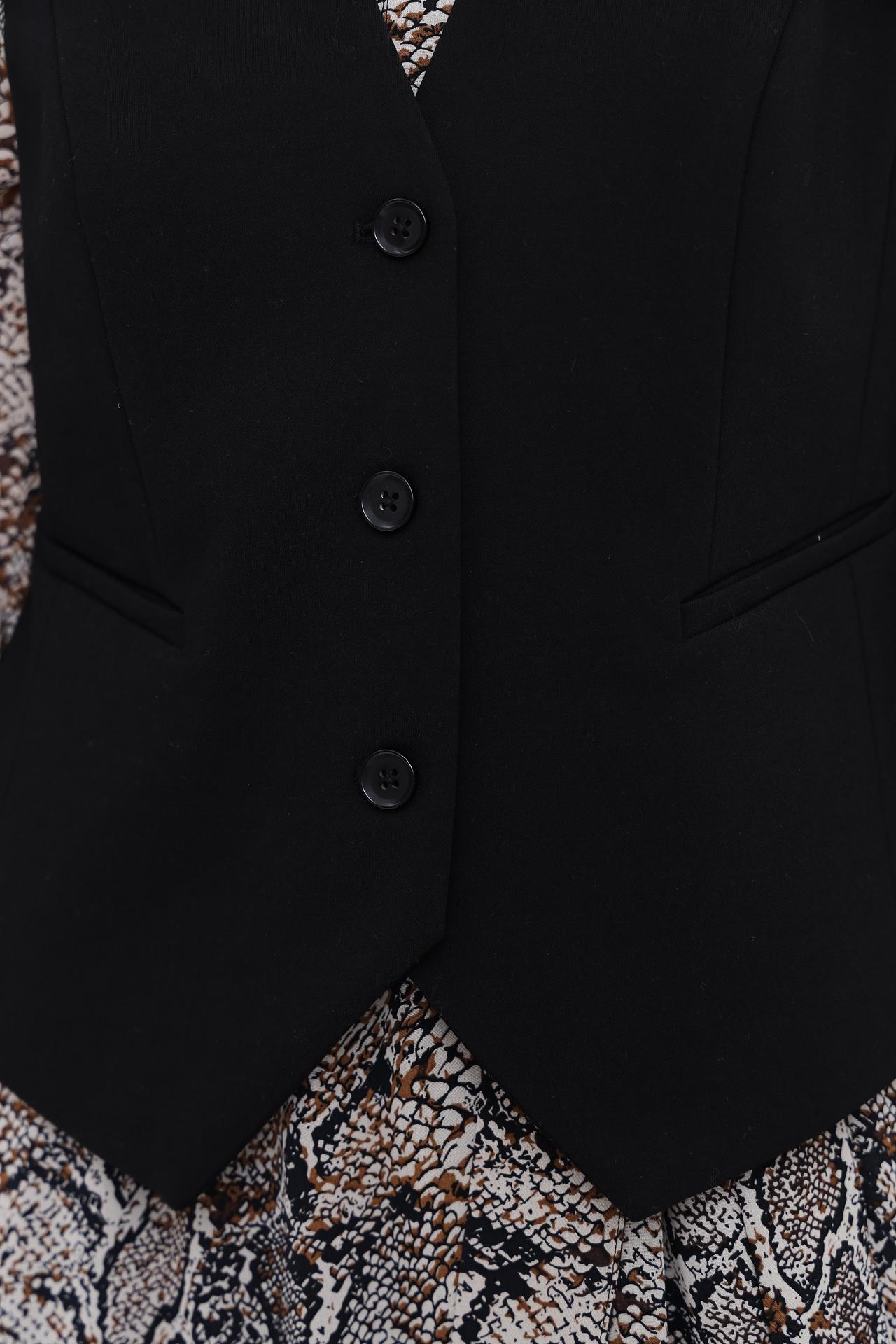 Универсальный черный цвет позволяет сочетать его с различными блузами и платьями, создавая стильные и запоминающиеся образы. Этот жилет идеально подходит для создания делового или повседневного образа, добавляя нотку изысканности и элегантности. Он станет незаменимой вещью в вашем гардеробе.