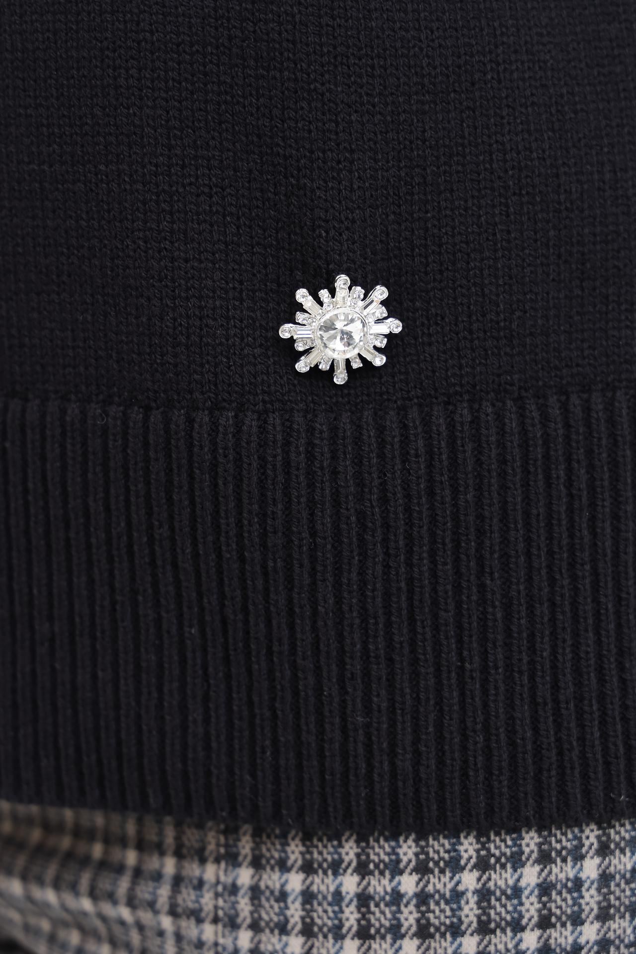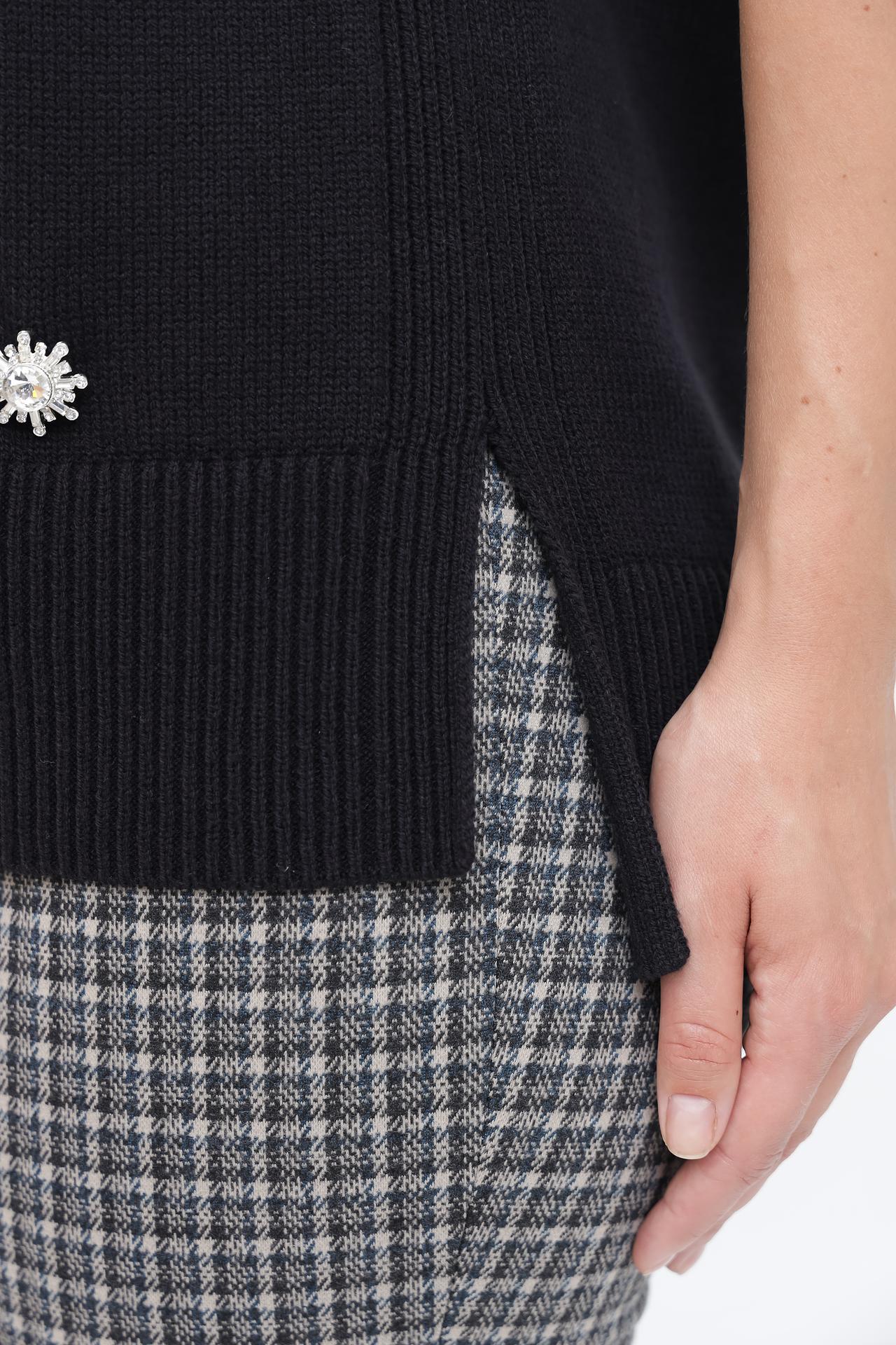 Лаконичный дизайн жилета дополнен изящным декоративным элементом в виде броши-снежинки со стразами, что добавляет изделию нотку утонченности. Эта базовая вещь легко впишется как в деловой, так и в повседневный гардероб. Носите его поверх блузки, водолазки или рубашки, сочетая с брюками или юбками.