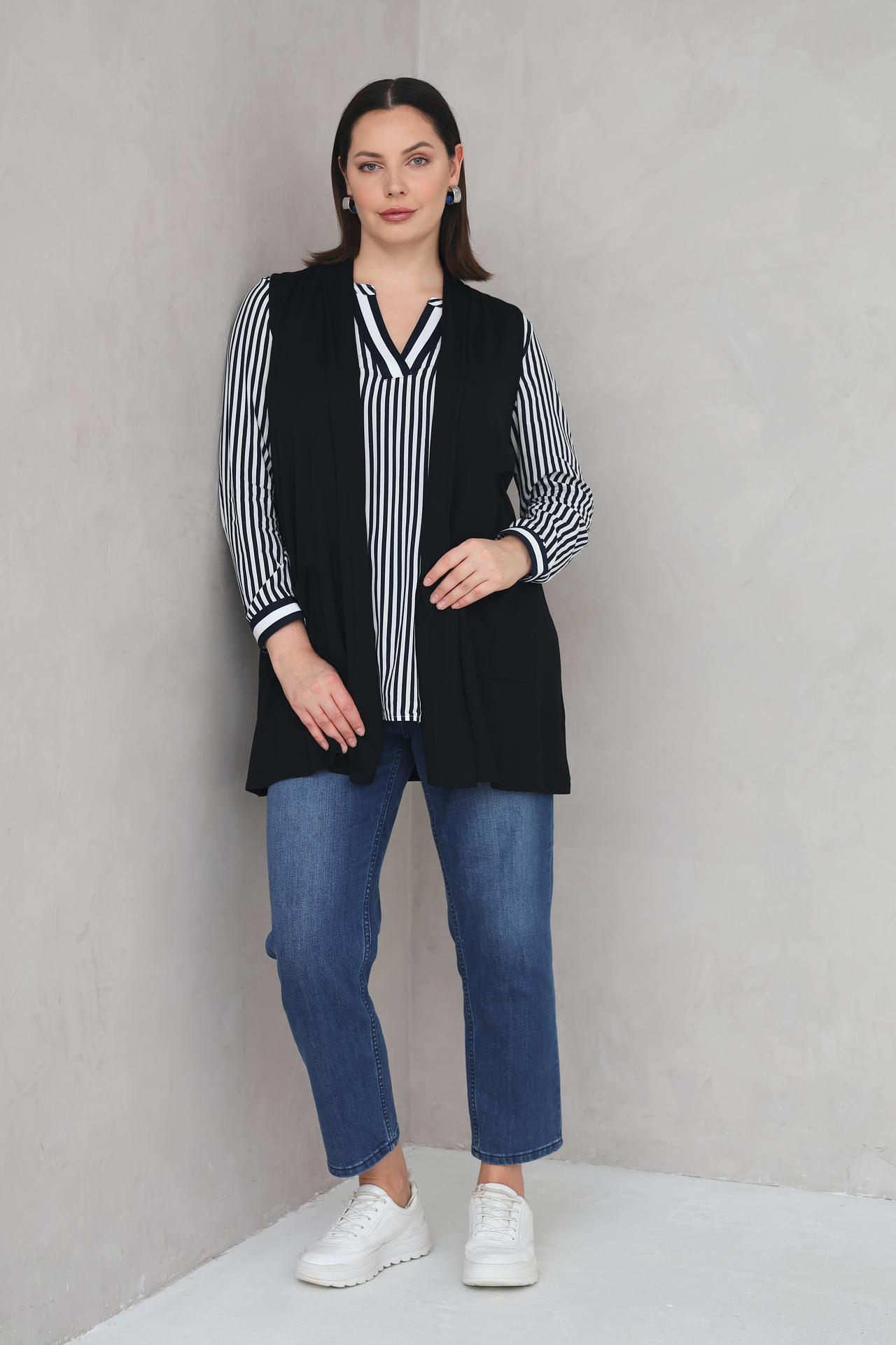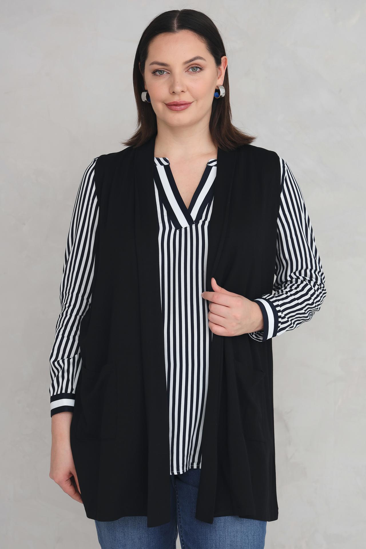 Идеальный выбор для создания элегантных образов – жилет от Via Appia. Эта модель гармонично дополнит ваш повседневный и деловой гардероб, придавая ему утонченность и стиль. Отсутствие застежки и свободный крой обеспечивают комфорт и свободу движений, а глубокие карманы добавляют практичности. Жилет отлично сочетается с блузками, рубашками и топами, позволяя создавать разнообразные многослойные комплекты. Актуальный черный цвет делает его универсальной базой для множества стильных комбинаций.