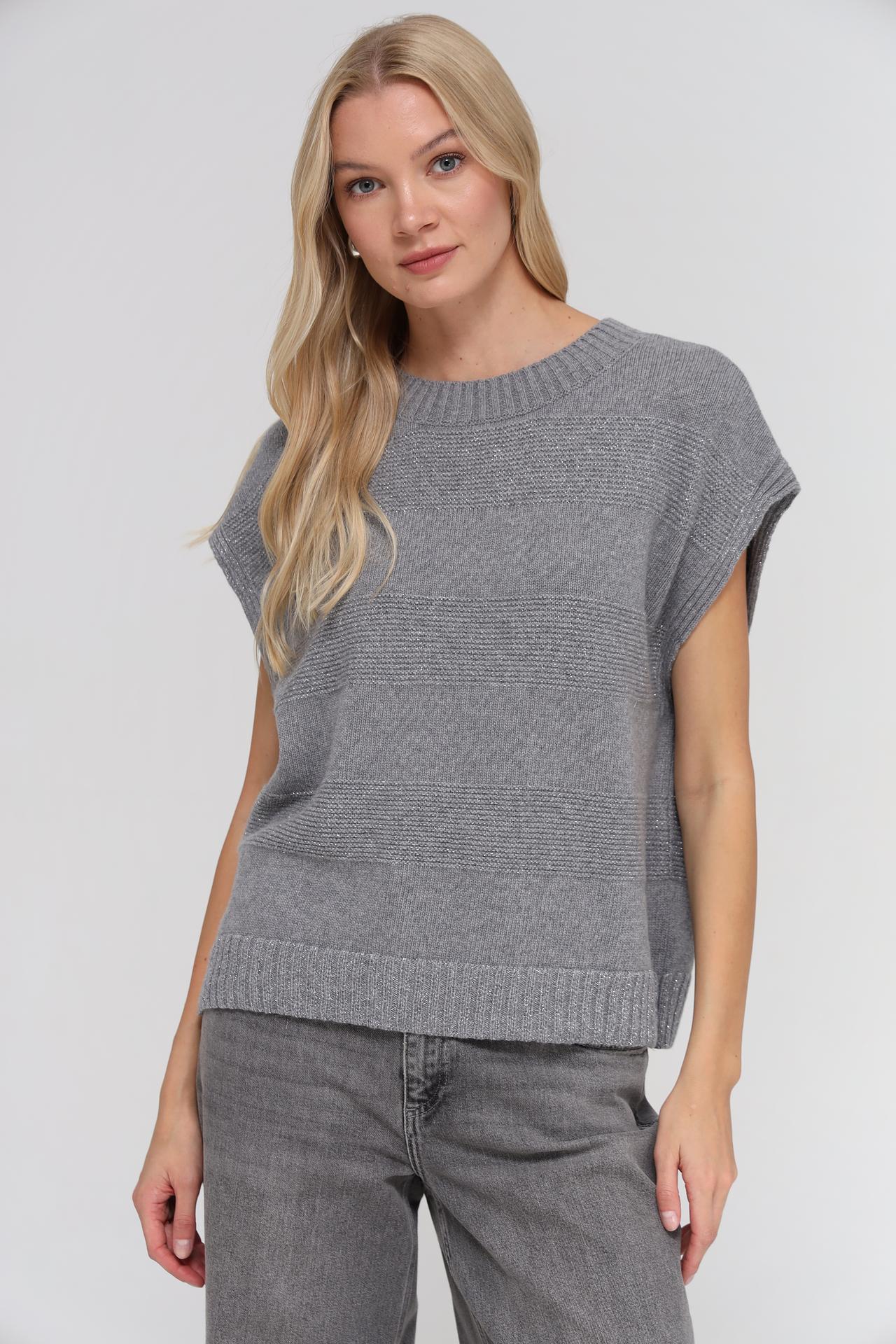 - Дизайн: Классический крой без рукавов с круглым вырезом горловины и эластичной резинкой по низу. Оригинальные горизонтальные полосы с блестящей нитью добавляют акцент.