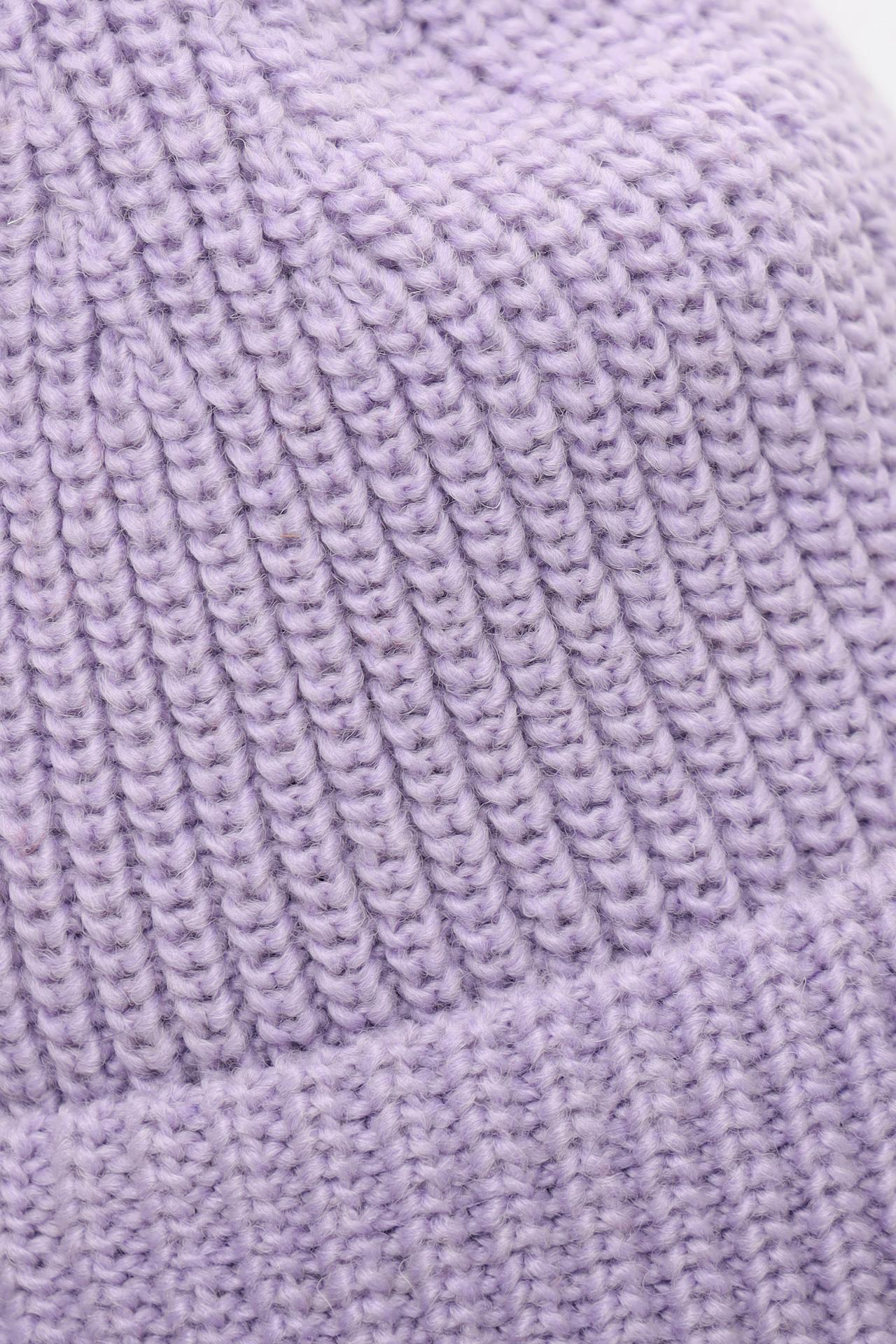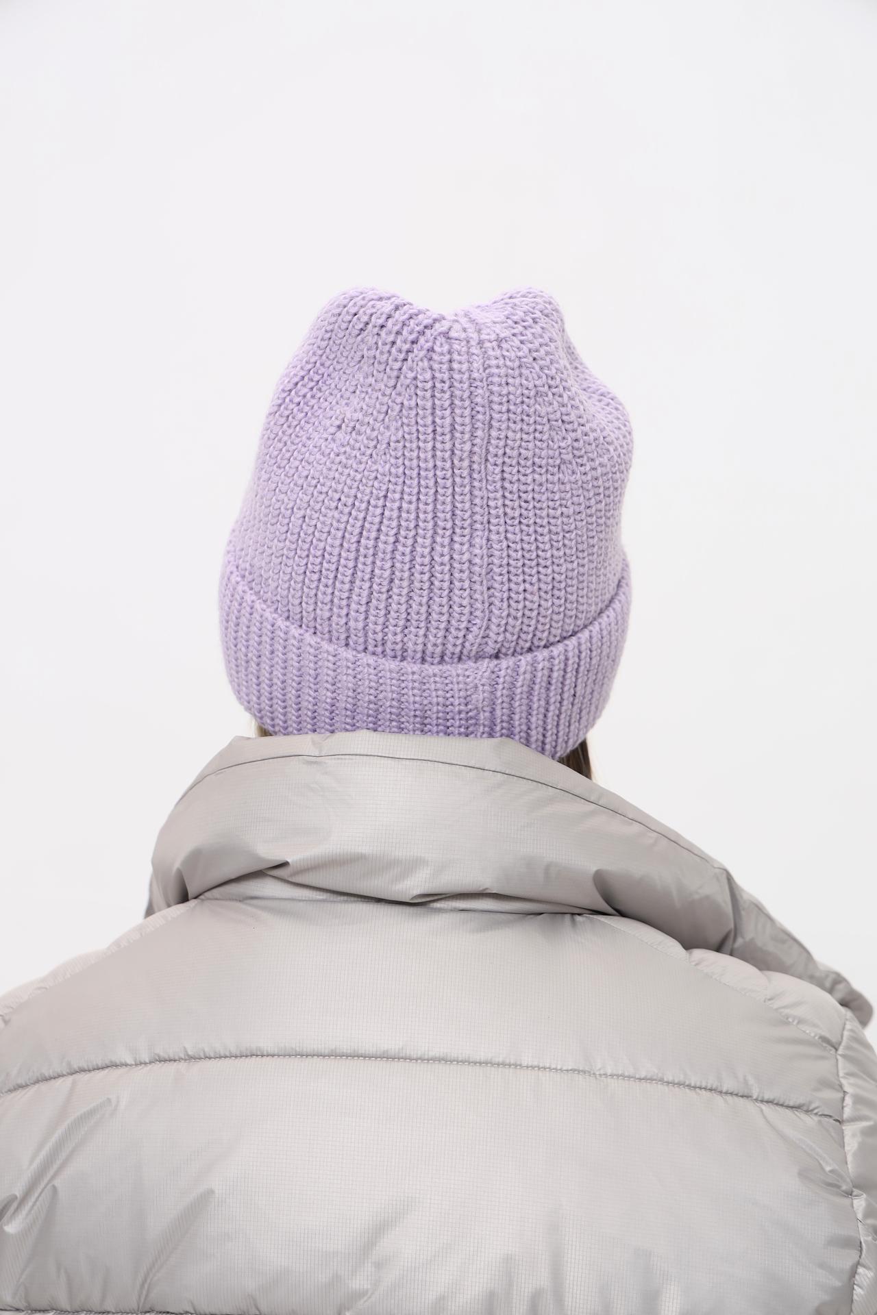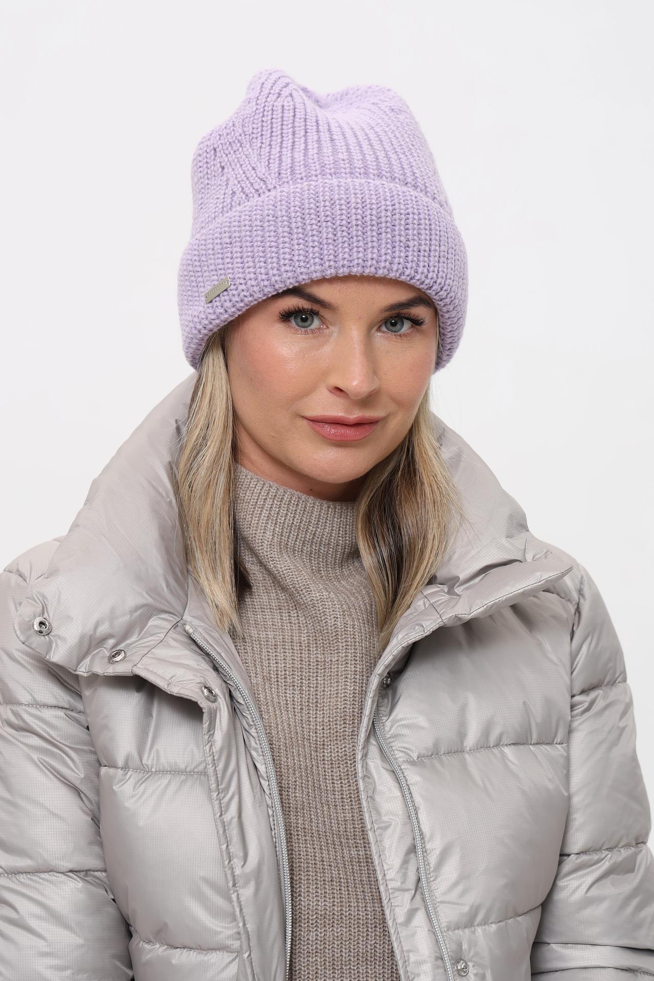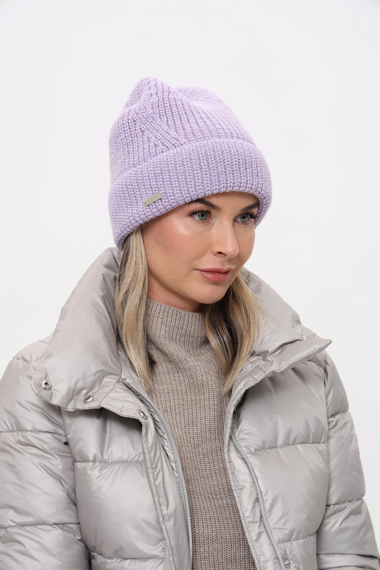 - Дизайн и стиль. Классическая женская шапка-бини крупной вязки в нежном сиреневом оттенке. Лаконичная металлическая бирка с логотипом бренда на отвороте подчеркивает качество и внимание к деталям, делая эту модель стильным и узнаваемым аксессуаром.