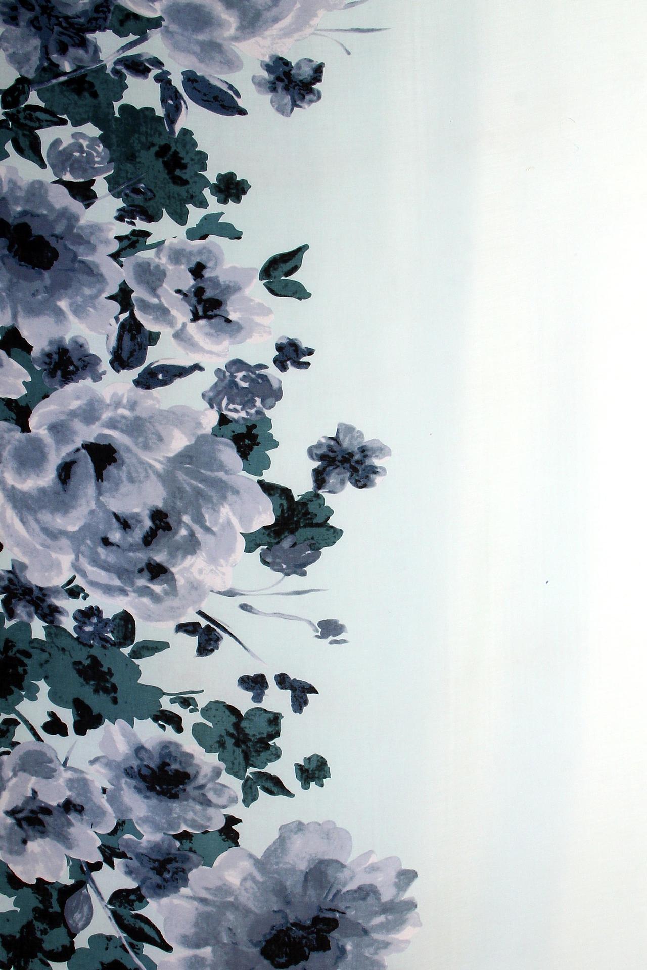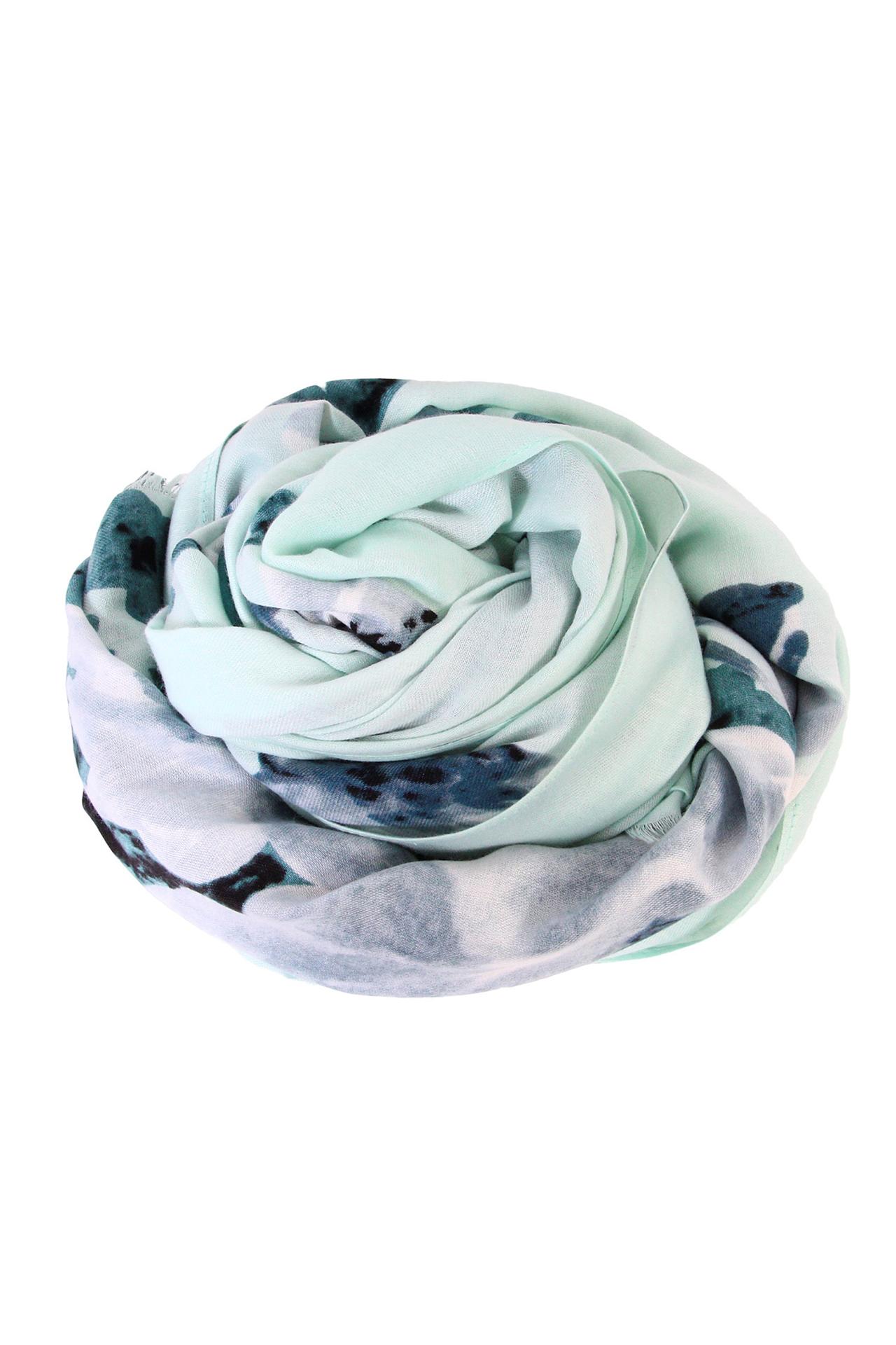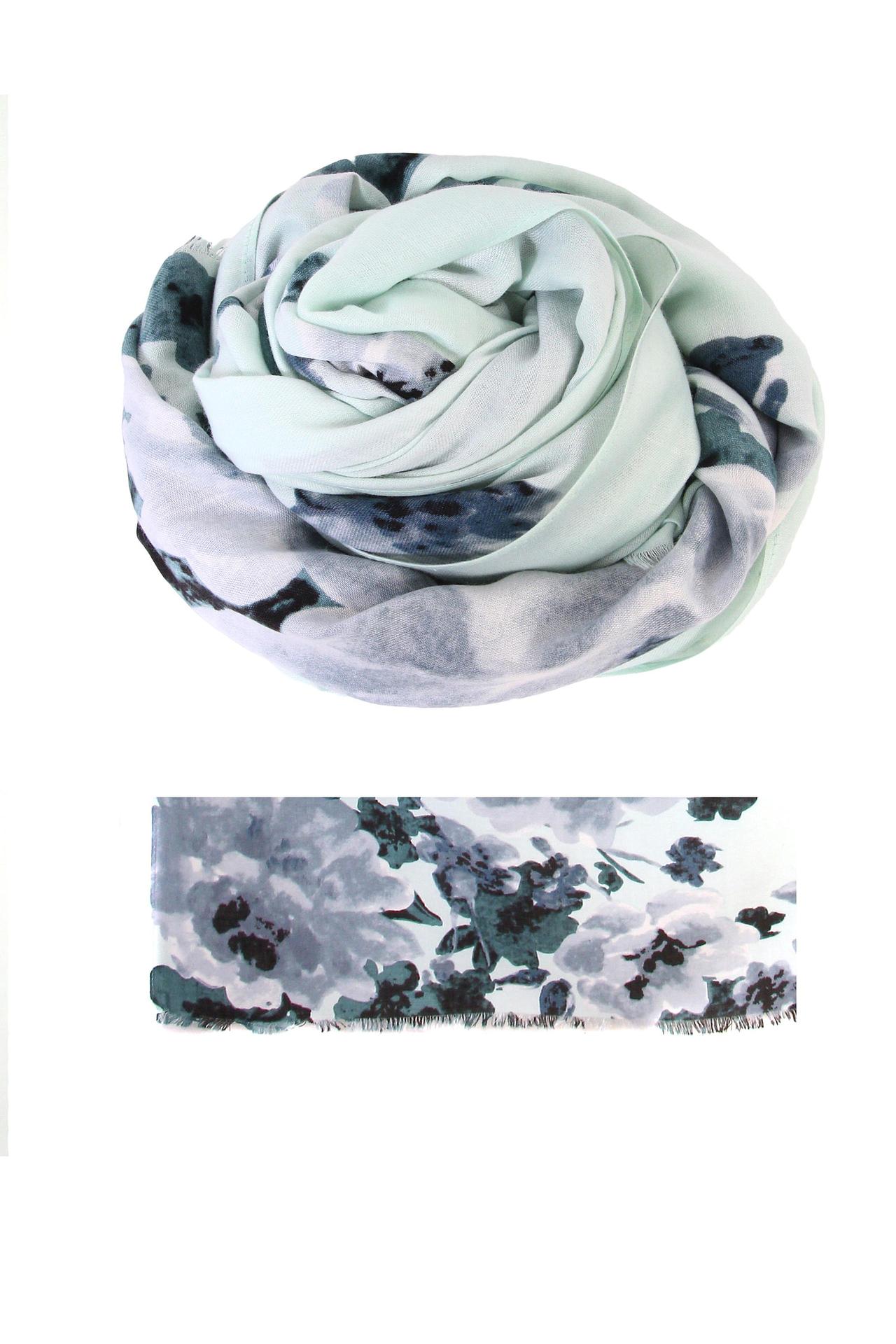 Дизайн палантина украшен изящным цветочным принтом, который придает изделию свежий и романтичный вид. Сочетание мятных, серых и белых оттенков делает его универсальным для различных цветовых решений в одежде. Цветочный узор элегантно дополняет весенний или летний образ, а также освежает осенние комплекты.