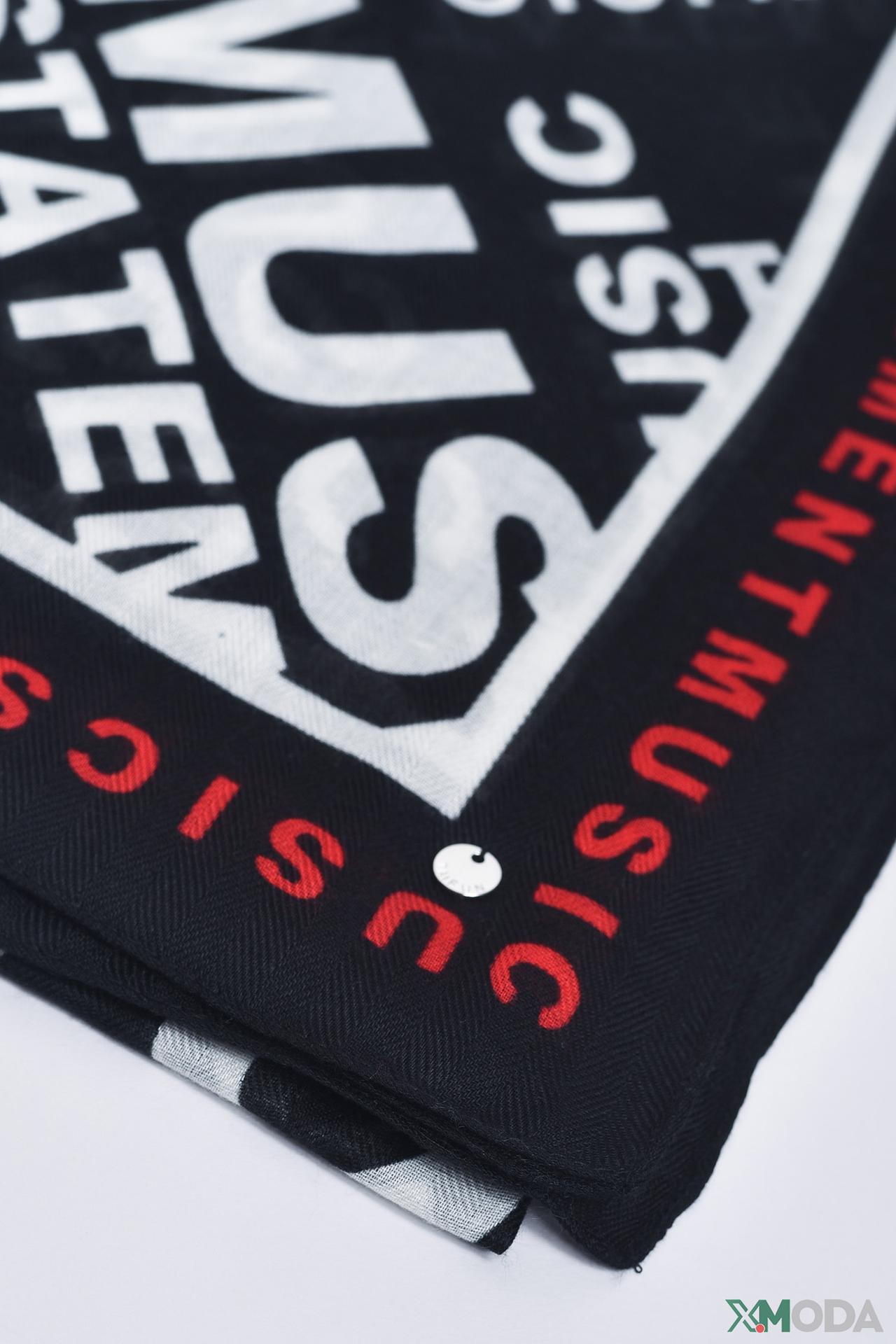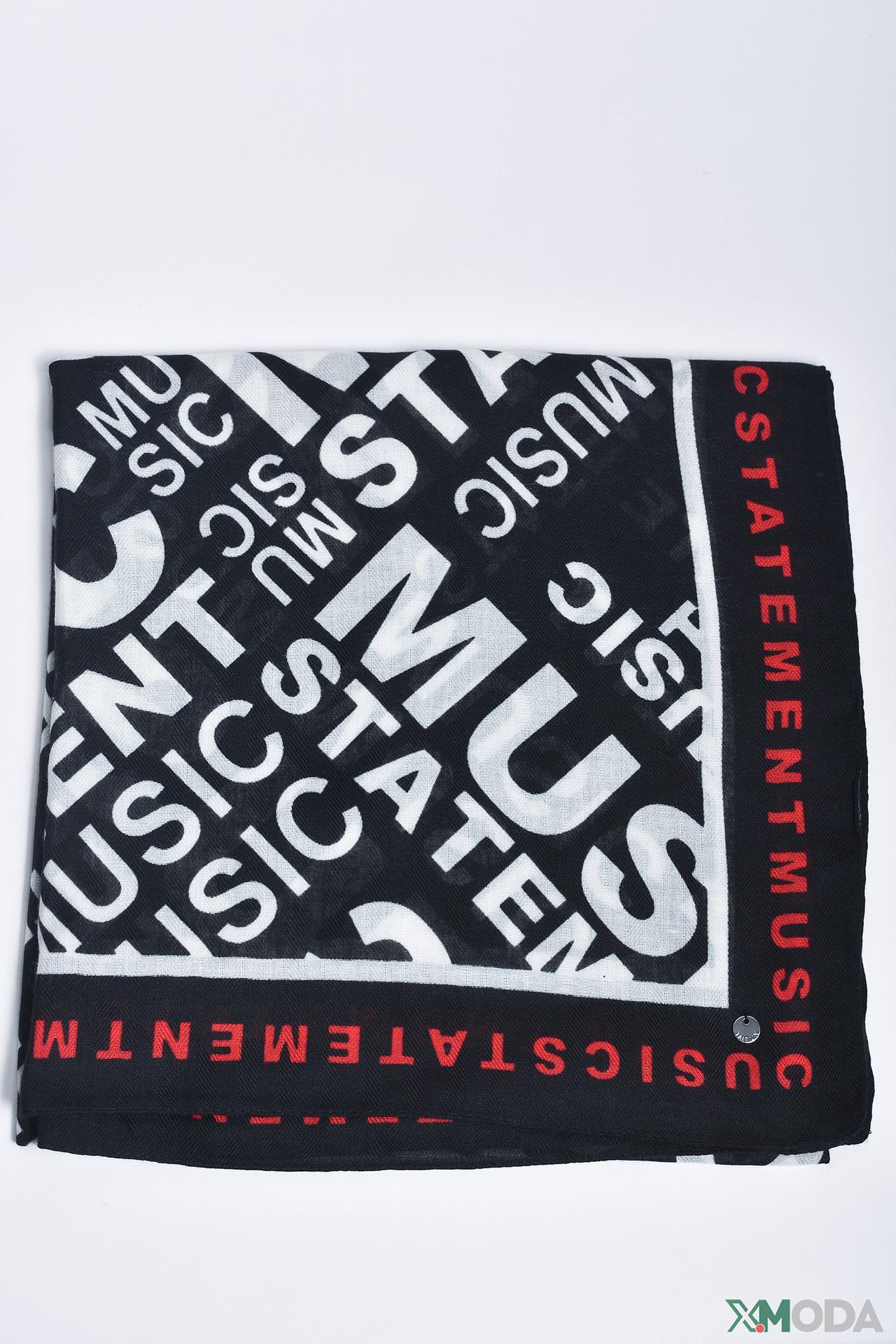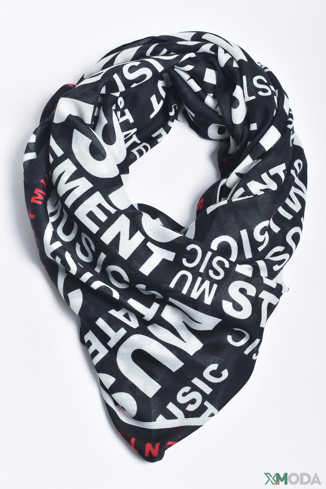 - Дизайн: Яркий и смелый принт с надписями «Statement», «Music» и другими словами, выполненный в контрастной черно-белой гамме с красными вкраплениями, гарантирует, что платок станет центром внимания.