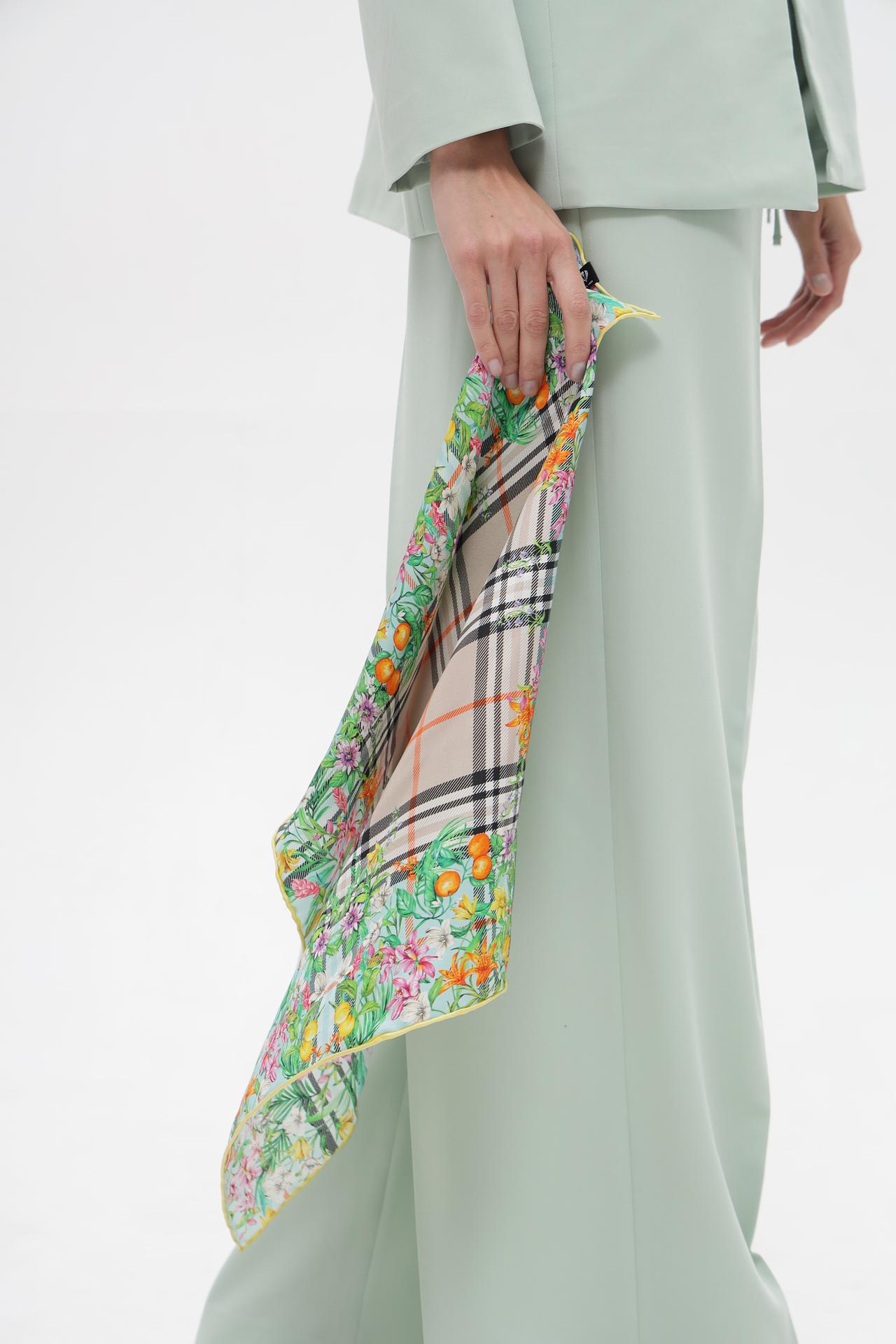 Платок с уникальным дизайном сочетает в себе тропические мотивы и классическую клетку, что делает его универсальным аксессуаром для различных образов. Освежите свой гардероб яркими красками и добавьте нотку роскоши с этим шелковым платком.