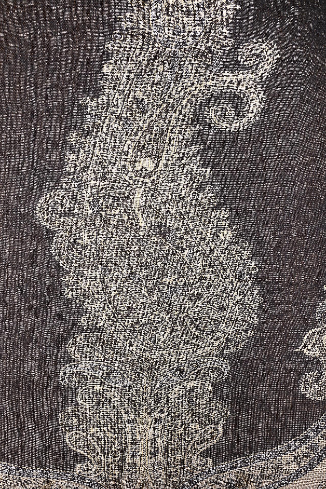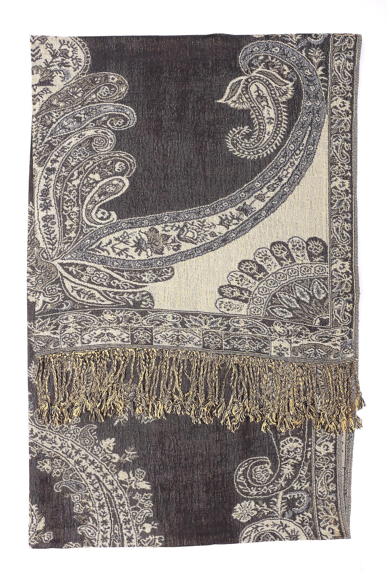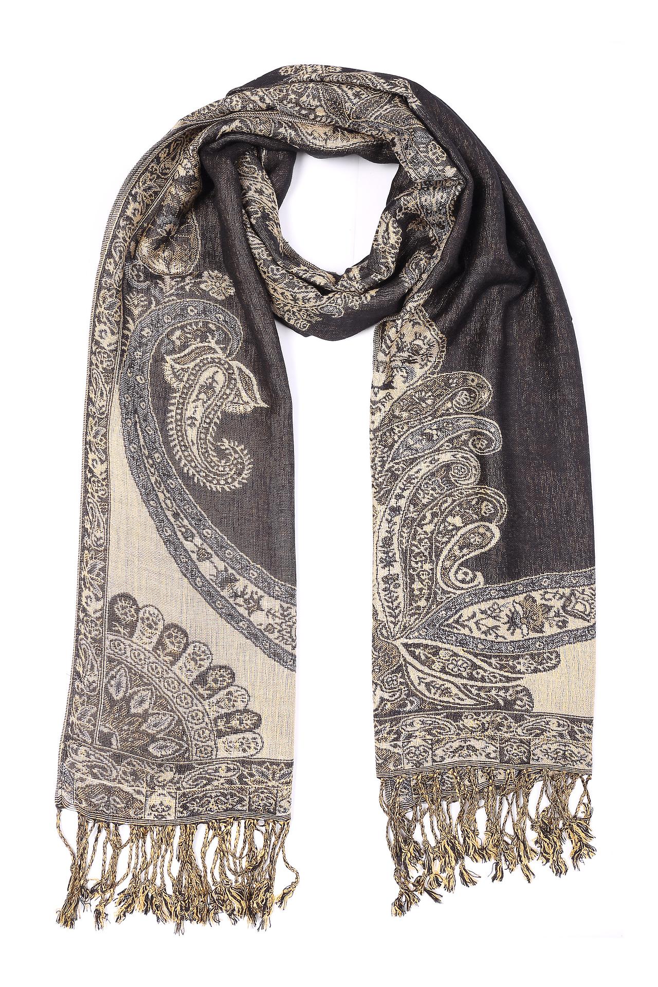 - Отделка: Платок декорирован бахромой по краям, что придает ему дополнительный объем и фактурность. Бахрома выполнена в золотистых тонах, подчеркивая роскошь изделия.
