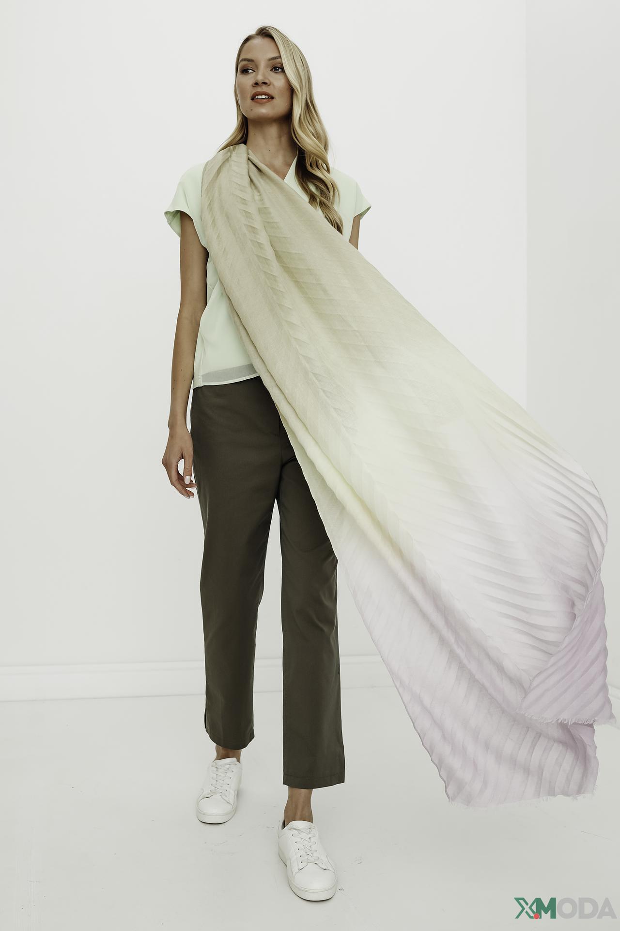 Шарф выполнен из высококачественного материала (90% полиэстер, 10% вискоза), что гарантирует его долговечность и устойчивость к износу. Градиентный дизайн придает изделию современный и стильный вид, позволяя сочетать его с различными нарядами.