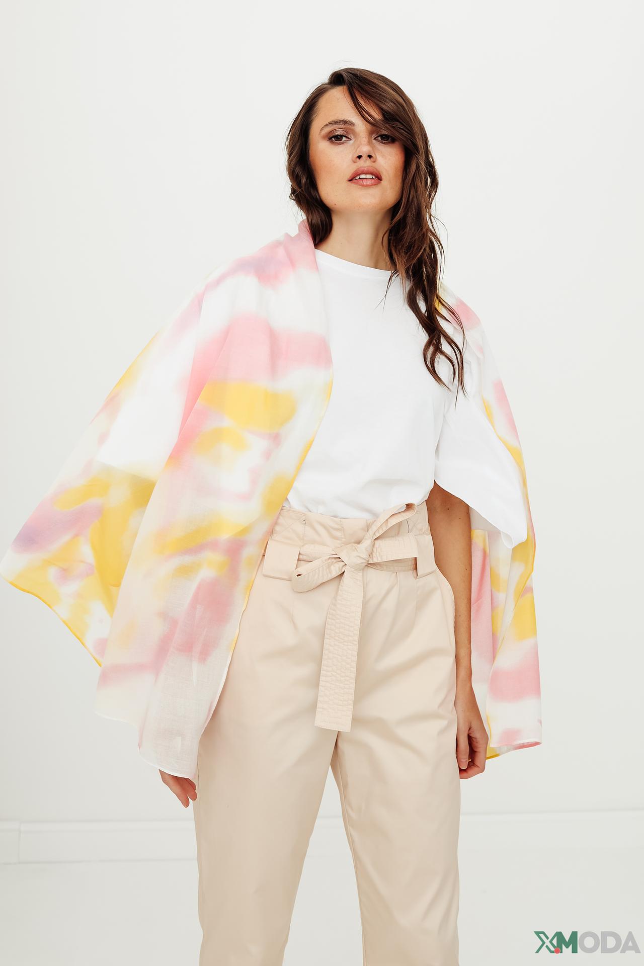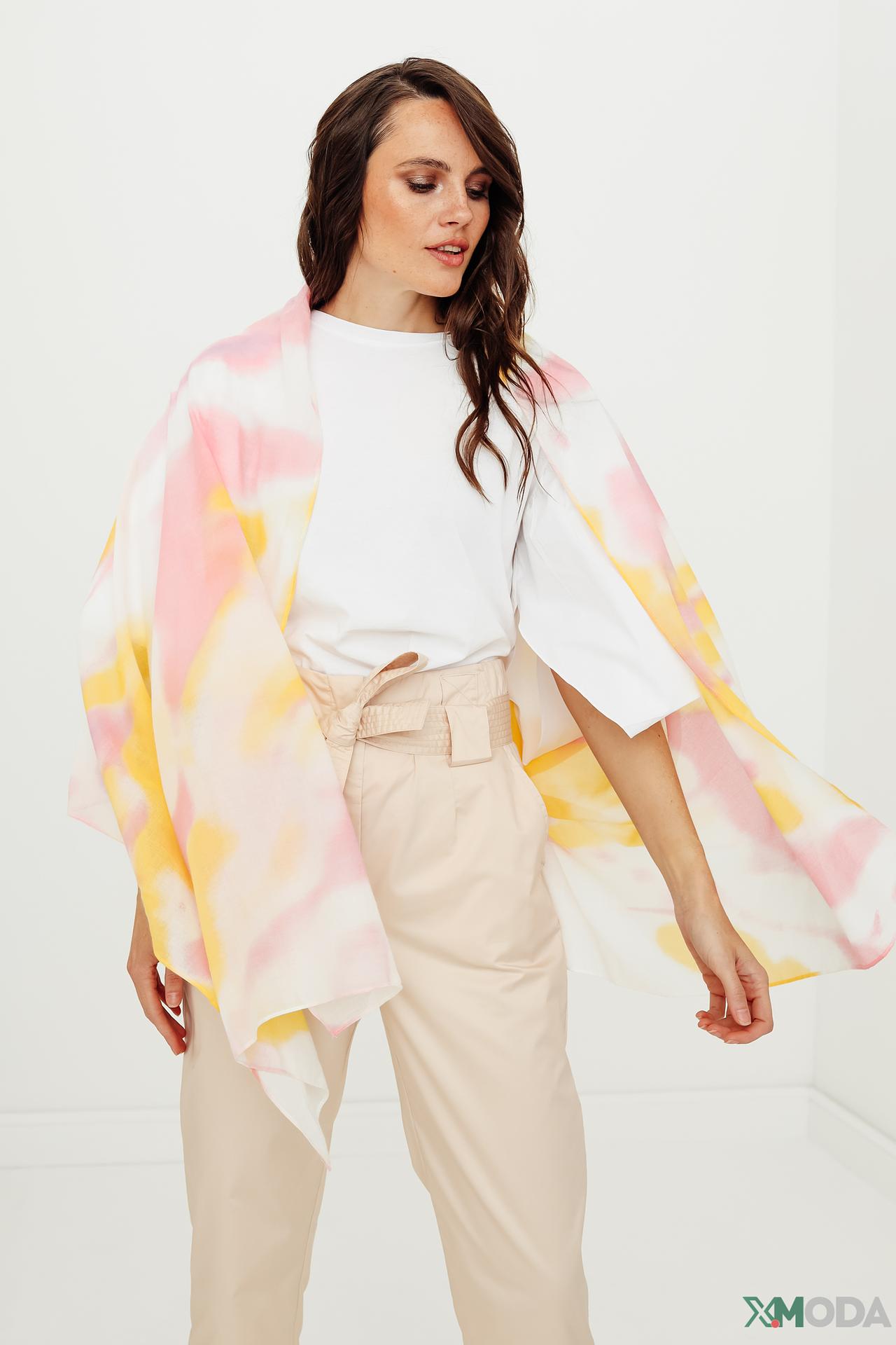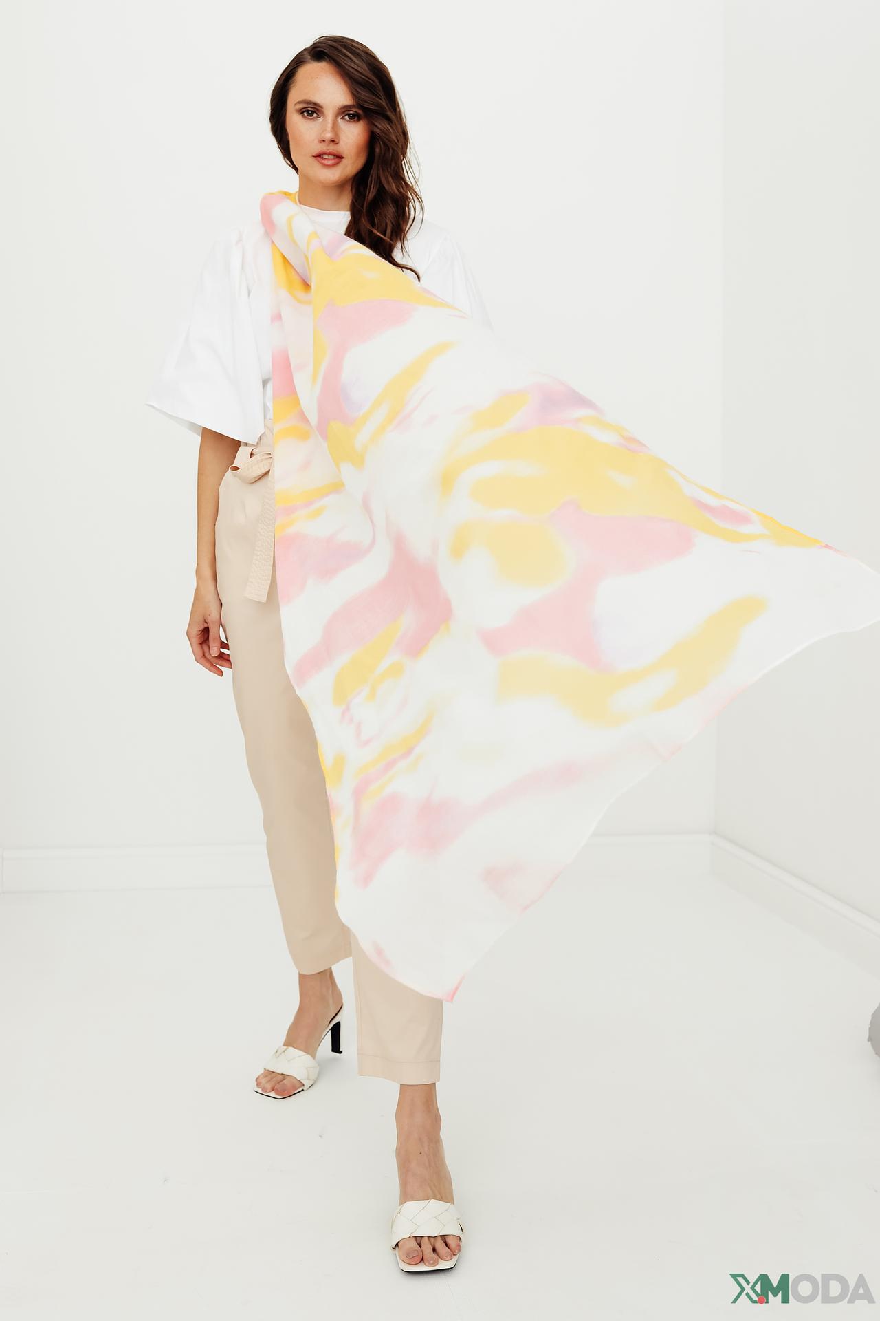 - Дизайн: Шарф представлен в белом цвете с красочным принтом, добавляющим образу яркость и оригинальность. Он легко впишется в любой гардероб.