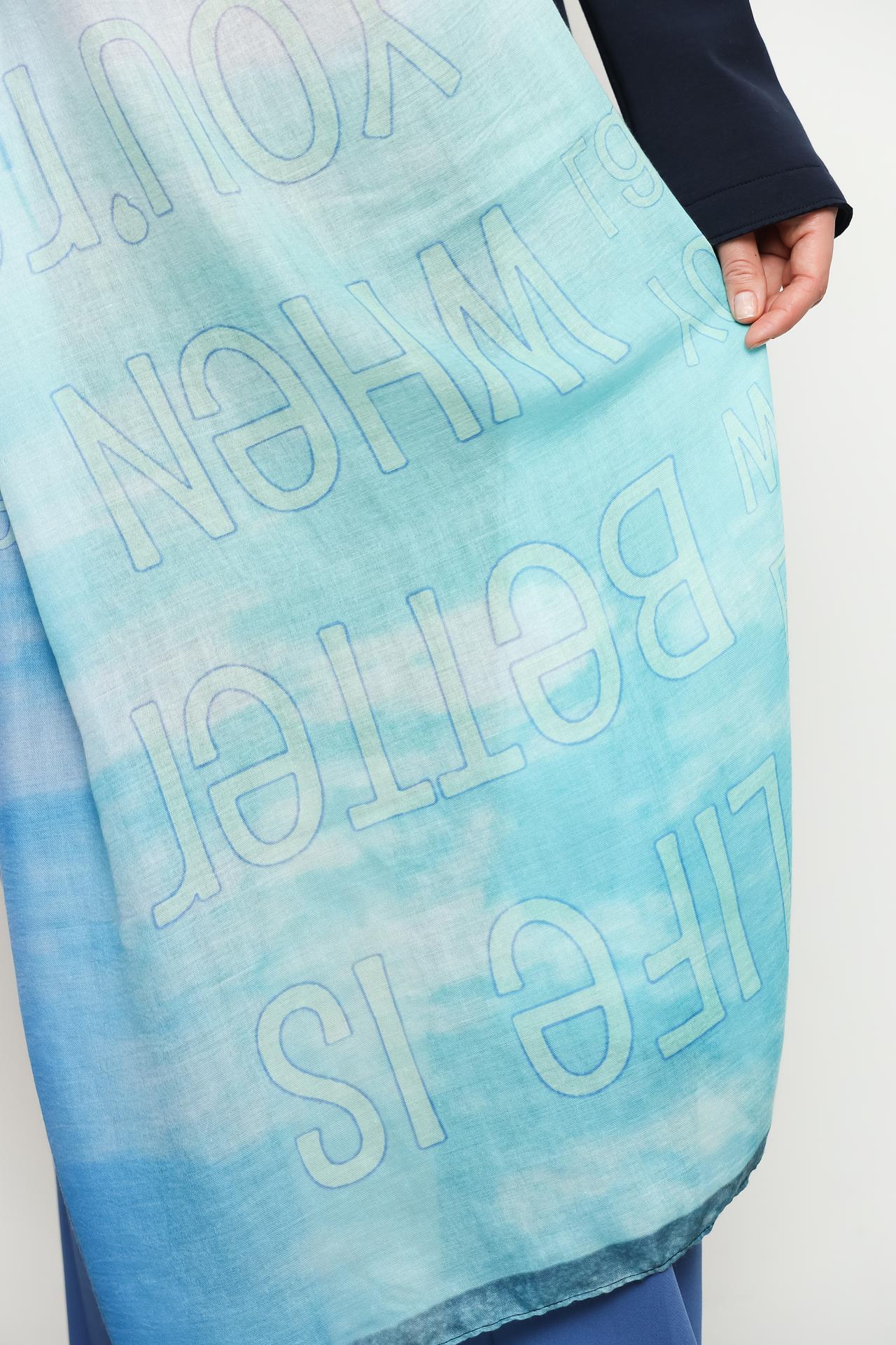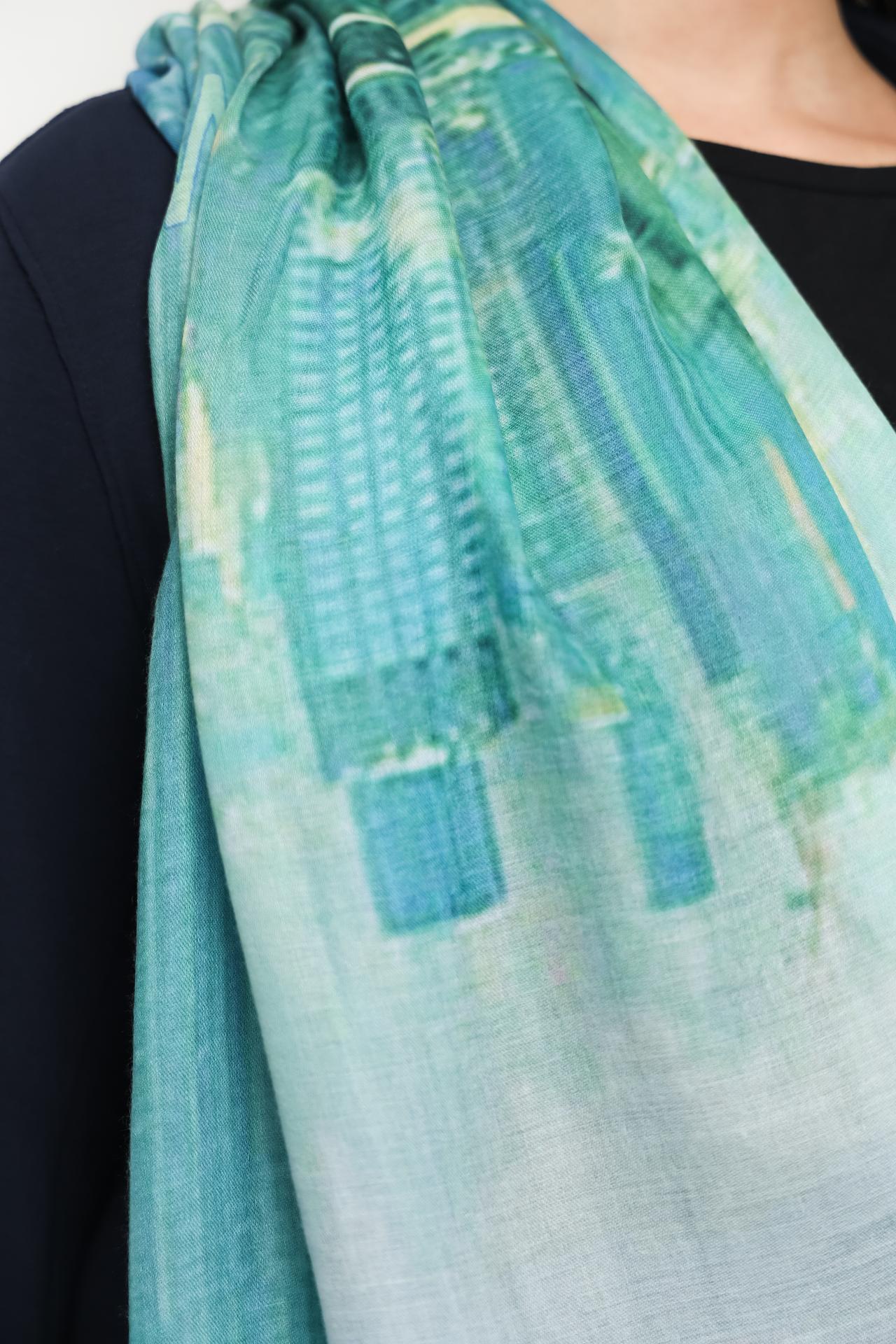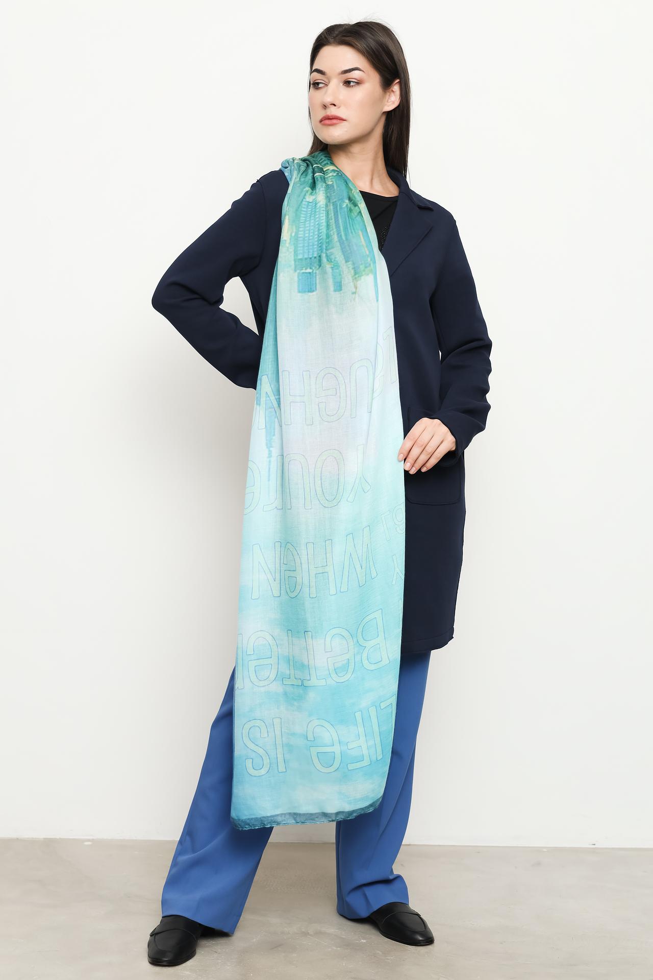 Женский шарф-палантин Bianca станет изысканным дополнением вашего гардероба. Выполненный из легкого и приятного на ощупь 100% полиэстера, этот длинный аксессуар украшен оригинальным принтом с городским пейзажем и надписями. Плавный градиентный переход от сине-зеленых до нежно-голубых оттенков придает ему особую выразительность.