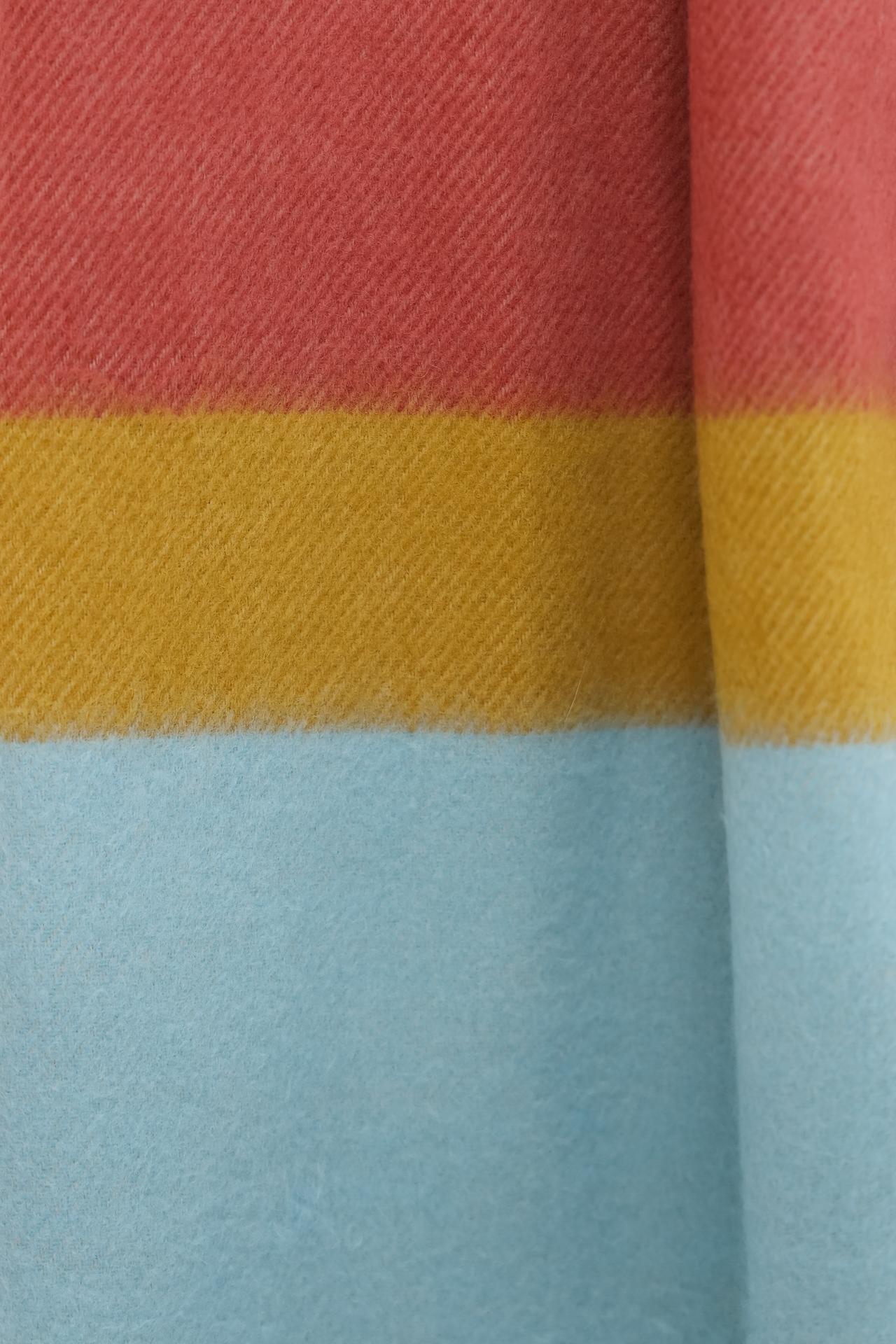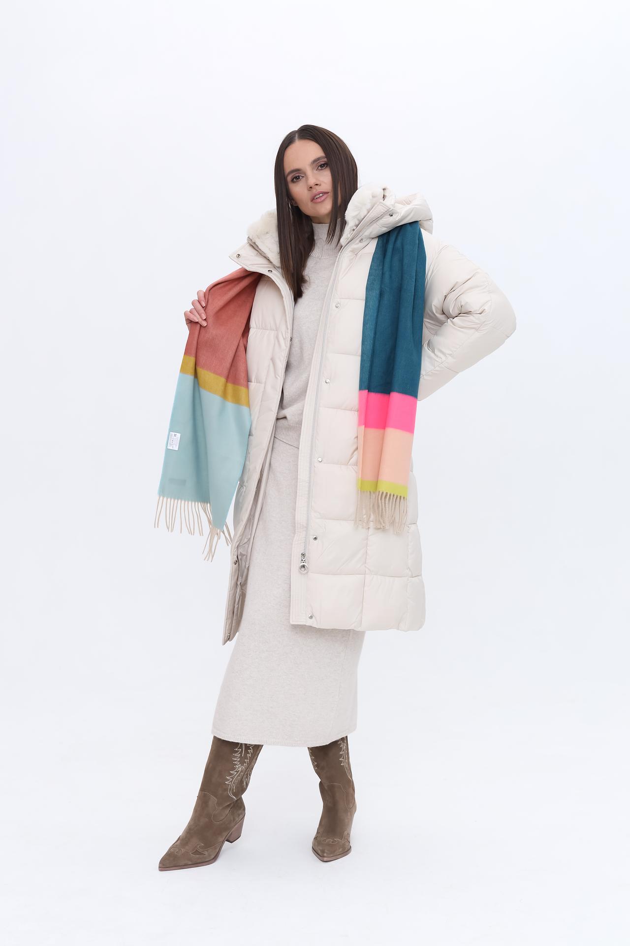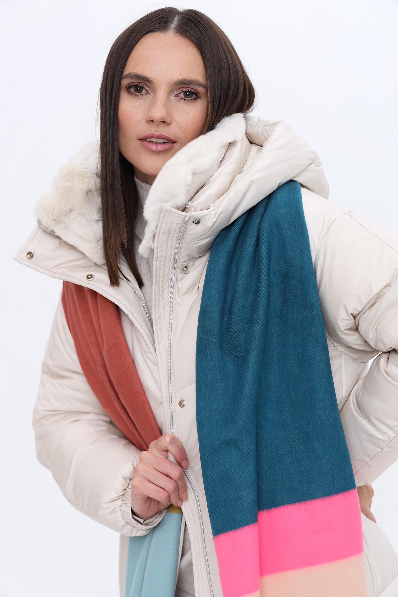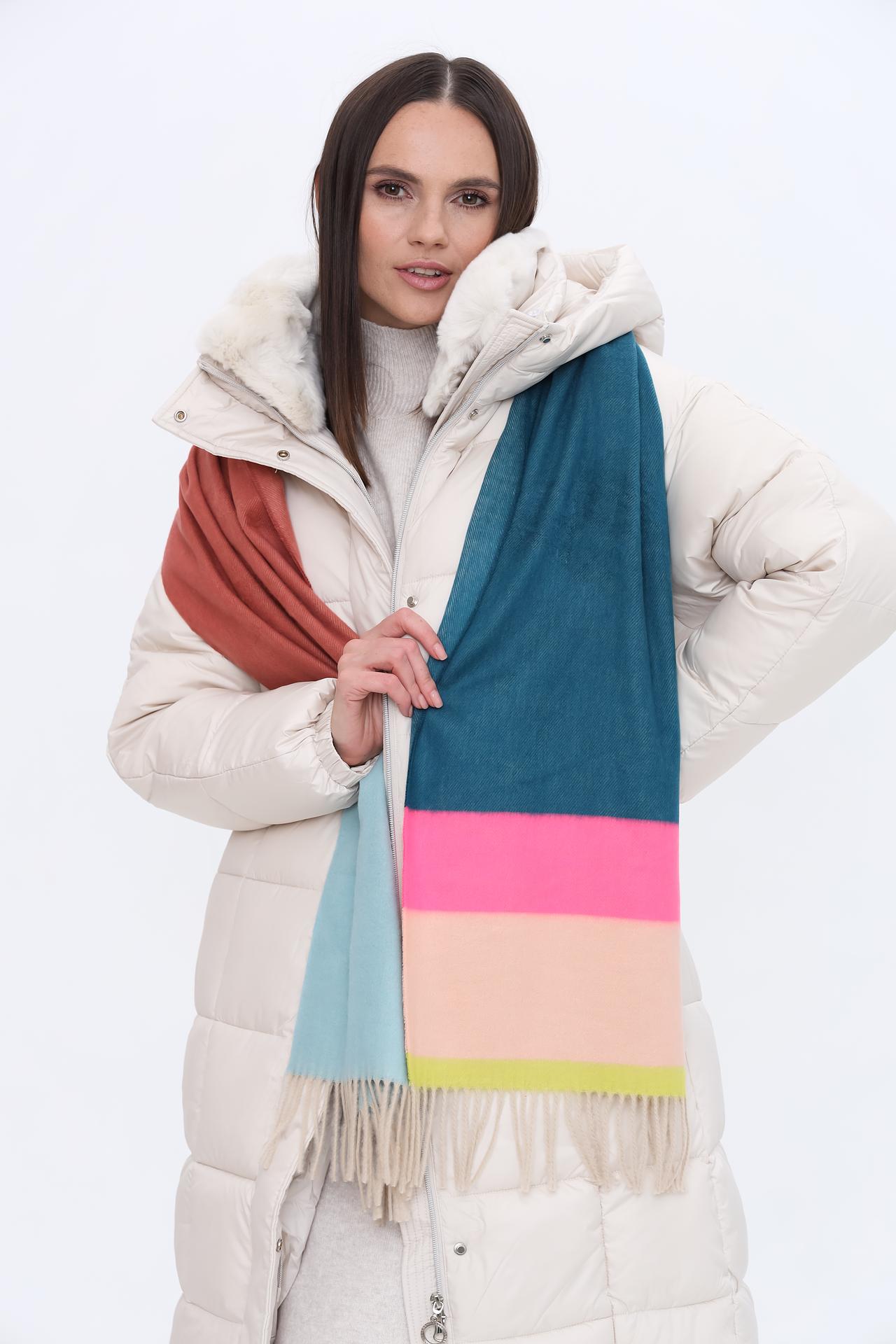 - Яркий многоцветный дизайн: Шарф украшен стильными горизонтальными полосами различных оттенков, включая синий, розовый, бежевый, желтый, голубой и оранжевый. Такое смелое цветовое решение позволяет легко комбинировать его с разнообразной верхней одеждой и добавлять акцент в повседневный или праздничный образ.
