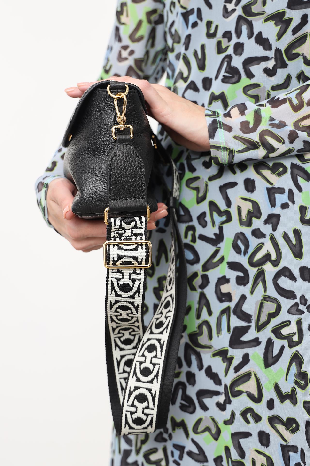- Дизайн. Чёрный цвет сумки – это классика, которая всегда в моде. Белый ремень с узором добавляет оригинальности и позволяет создавать стильные образы.