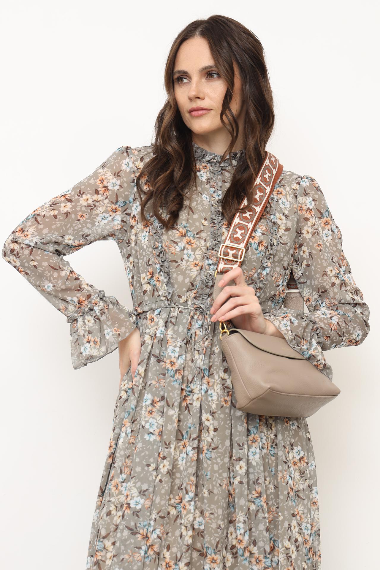 Сумка имеет стильный дизайн и удобный размер. В комплекте идет текстильный ремень с орнаментом, который добавляет образу яркости и индивидуальности. Золотистая фурнитура придает сумке изысканный вид.