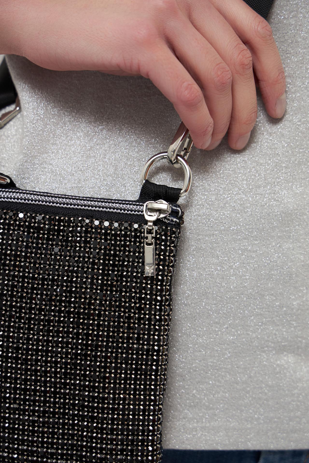- Дизайн: Элегантная черная сумка, полностью покрытая мелкими стразами, которые придают ей праздничный и изысканный вид.