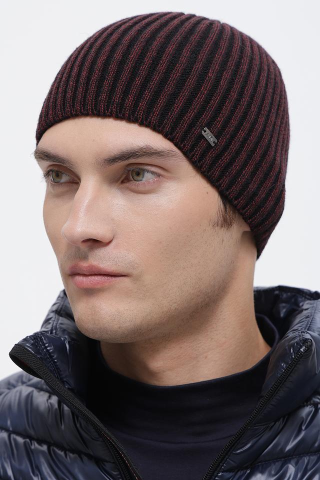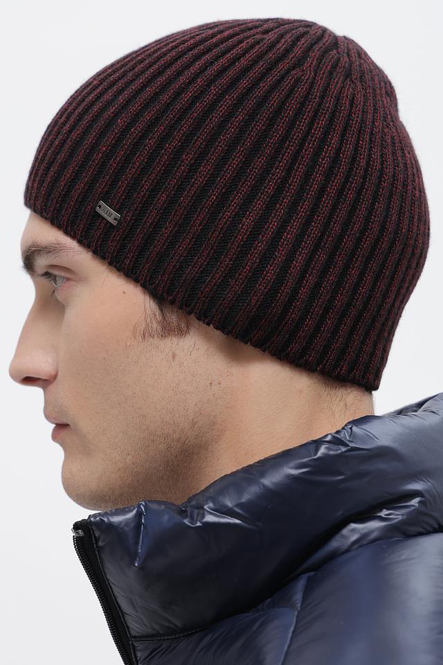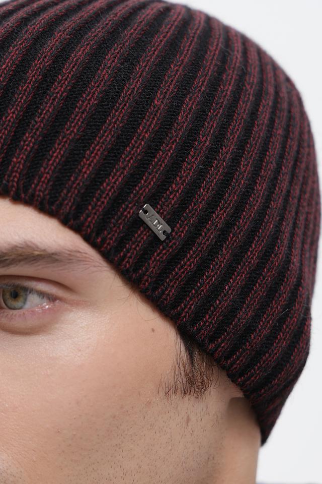 Шапка имеет облегающую форму и плотную вязку, что обеспечивает комфортную посадку и хорошую теплоизоляцию. Дизайн шапки выполнен в сочетании черного и красного цветов, что придает ей стильный и современный вид.