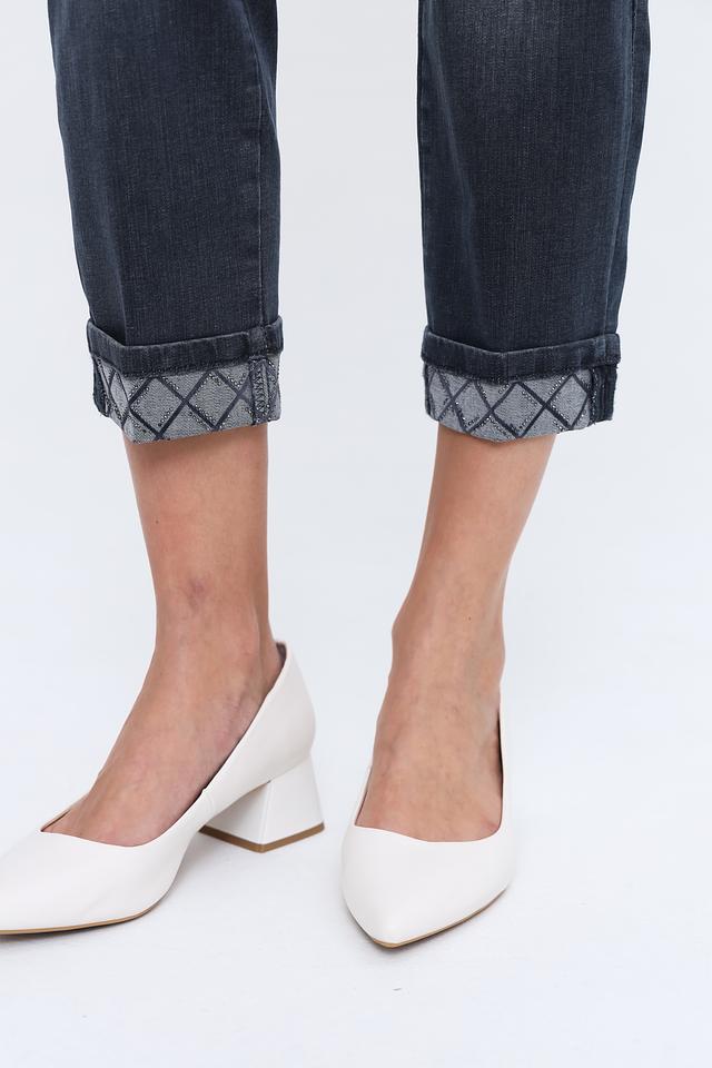 Джинсы имеют классическую посадку на талии и застежку на металлическую пуговицу. На задних карманах расположен логотип бренда. Особый акцент сделан на декоративную отделку в виде вышивки на штанинах, которая придает джинсам оригинальность и индивидуальность.