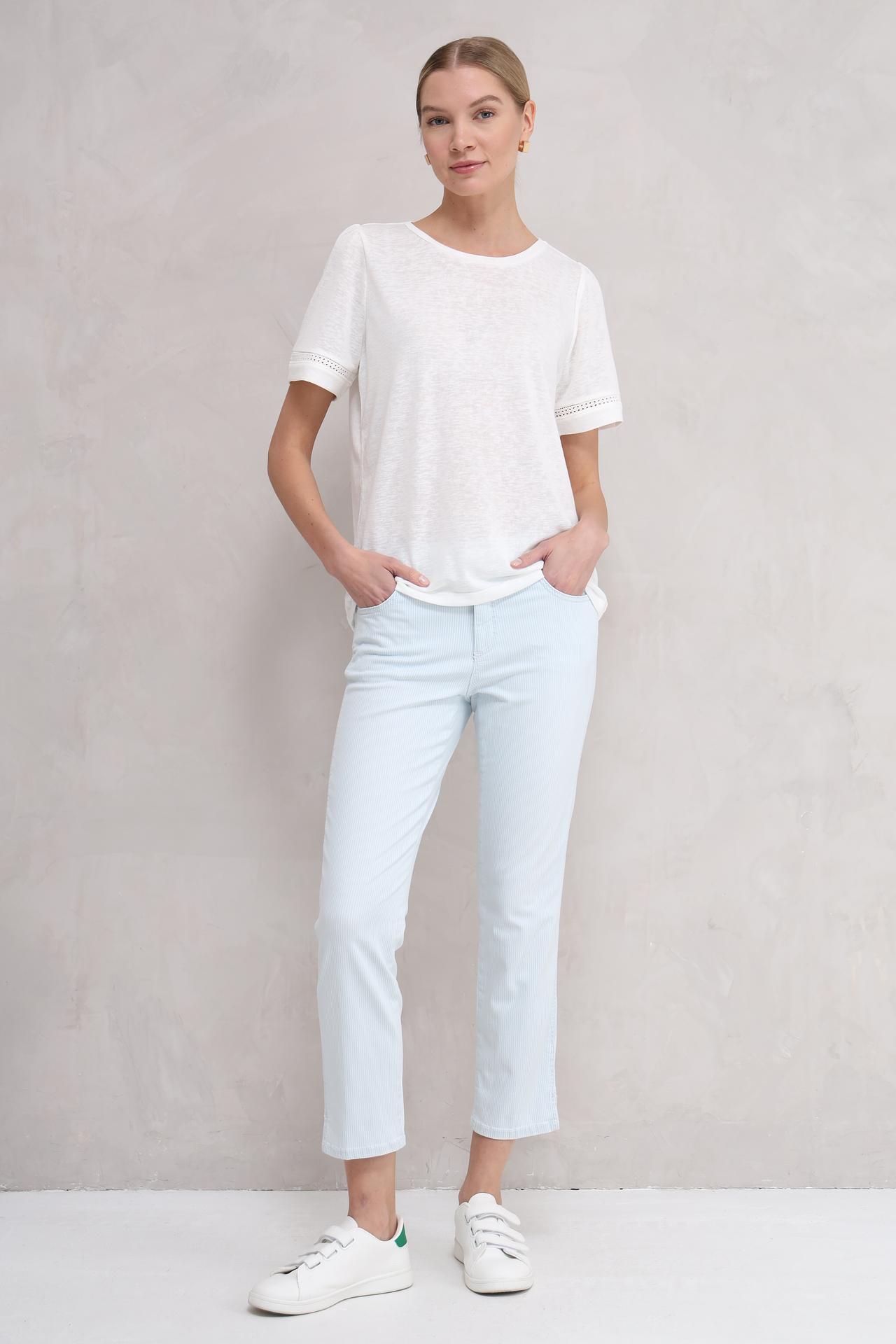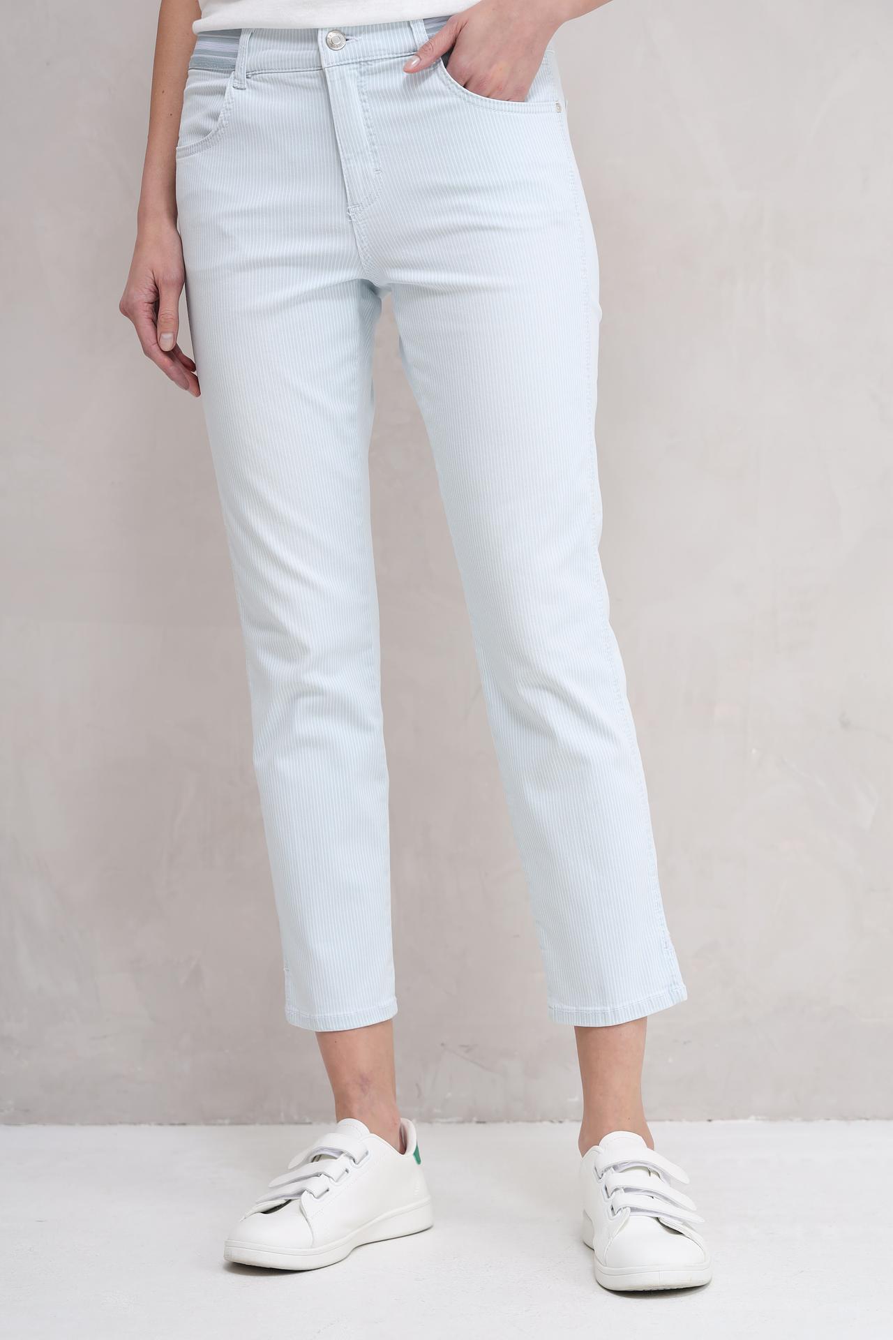- Актуальный дизайн: Голубой цвет в тонкую вертикальную полоску делает джинсы визуально стройнящими и добавляет изюминку в классический образ. Это стильное решение для демисезонного и летнего гардероба.