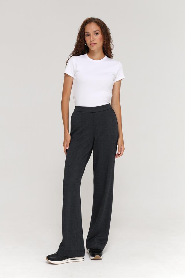 Брюки имеют прямой крой и клёш от колена, что придает им элегантный и современный вид. Эластичный пояс обеспечивает удобную посадку по фигуре, а также позволяет легко надевать и снимать брюки.