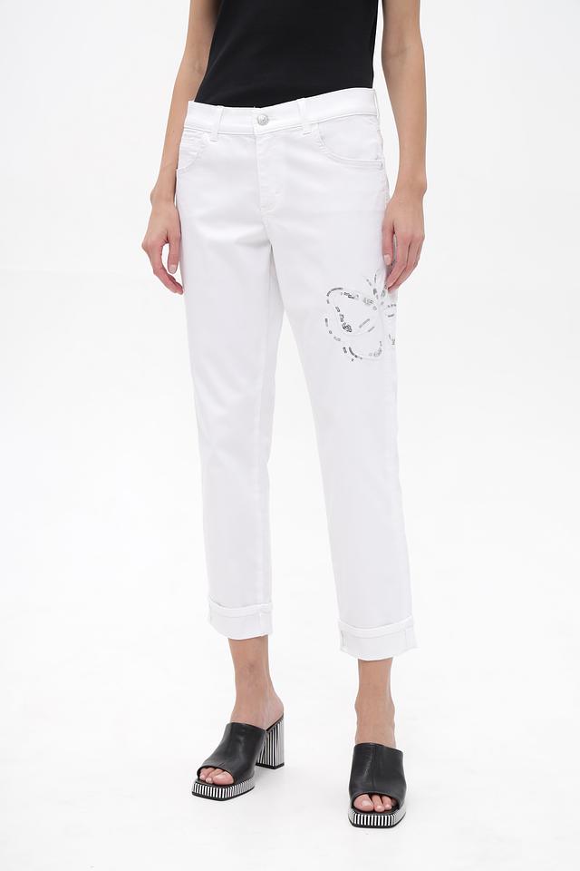 Белые укороченные джинсы Angels из хлопка с полиэстером и эластаном. Модель украшена вышивкой в виде лица. Удобный крой и стильный дизайн. Состав: хлопок 77%, полиэстер 20%, эластан 3%