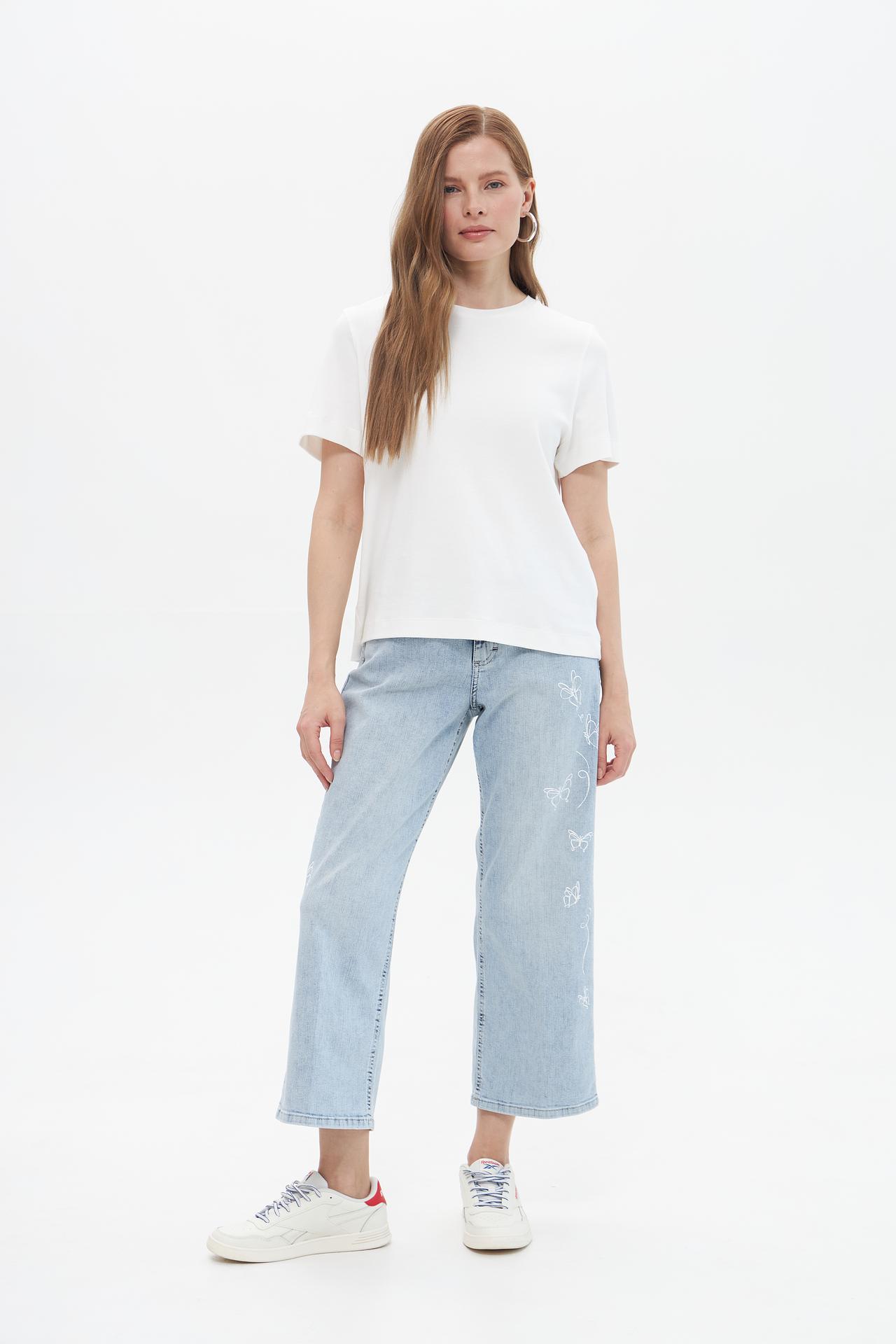 - Изысканная вышивка: Декоративные элементы в виде нежных белых бабочек, расположенные вдоль боковых швов, придают модели особую изюминку. Эта уникальная деталь выделяет джинсы среди прочих, добавляя им легкости и женственности.