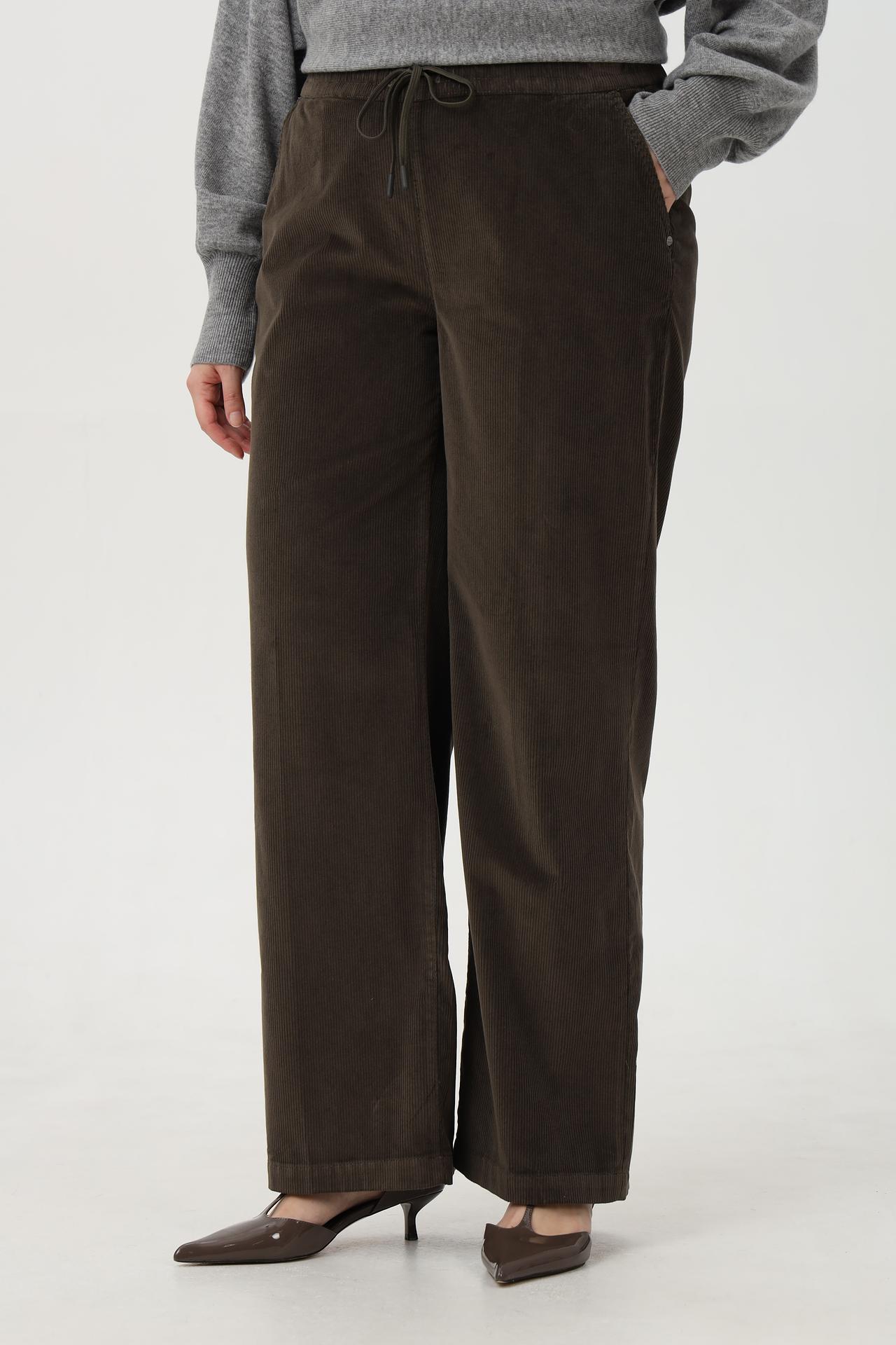 - Дизайн: Прямой крой штанин визуально удлиняет ноги, создавая элегантный силуэт. Вельветовая текстура придает изделию особый шарм и актуальность. Декоративный шнурок на поясе добавляет изюминку и позволяет регулировать посадку.