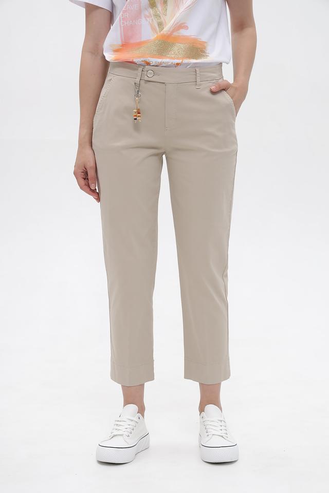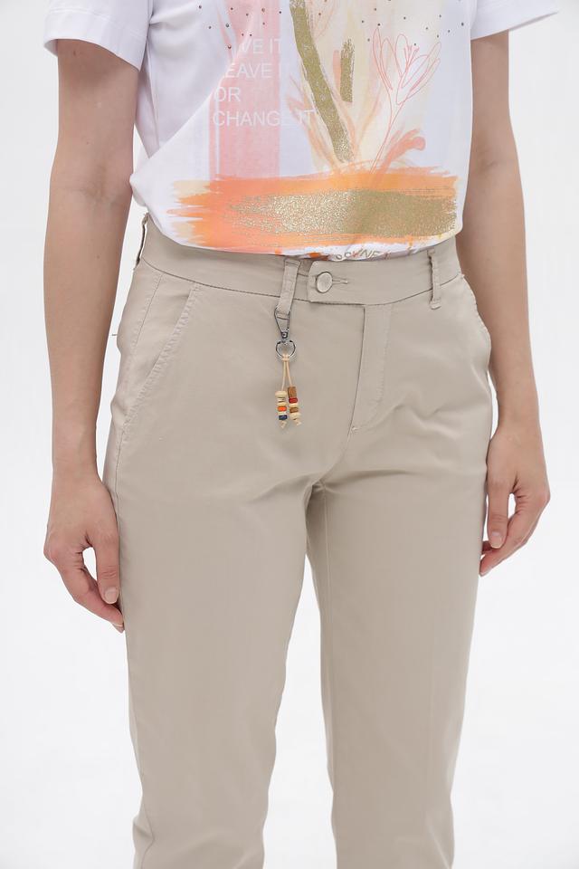 Брюки имеют прямой крой, который подчеркивает фигуру, не сковывая при этом движения. Бежевый цвет делает их универсальными и легко сочетаемыми с различными элементами гардероба. На поясе предусмотрены аккуратные петли для ремня, а также декоративный брелок с подвесками, добавляющий образу изюминку.