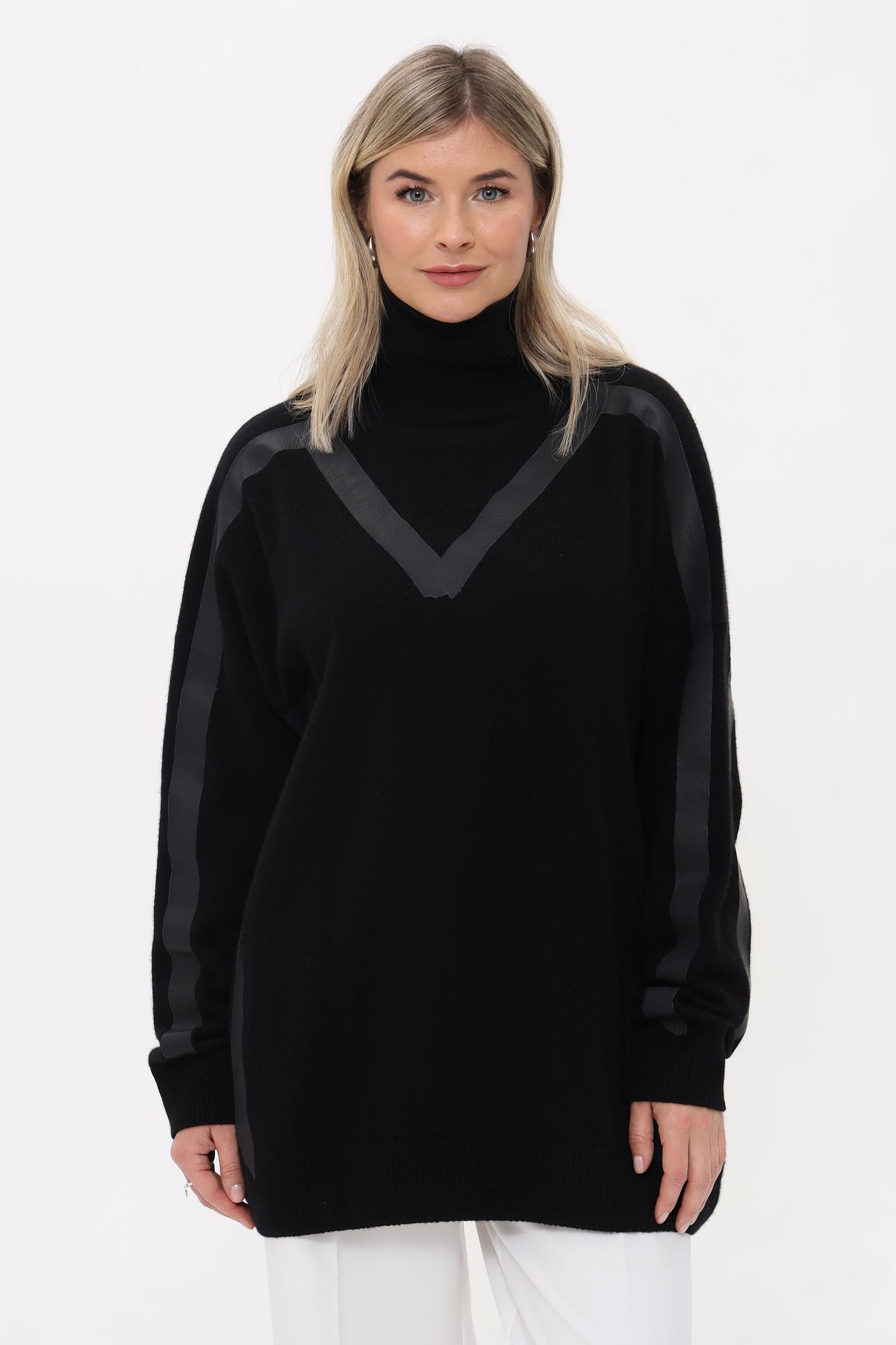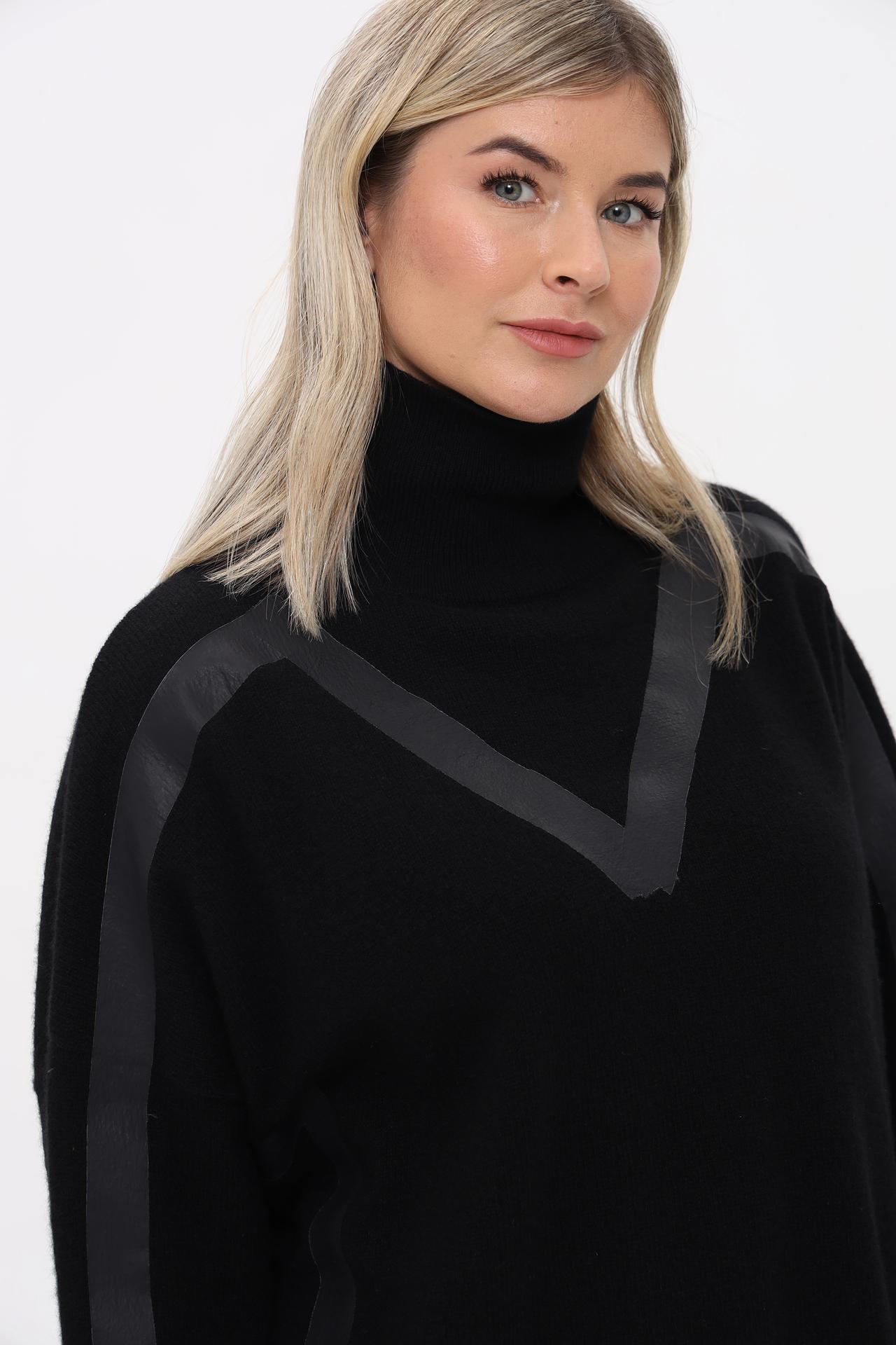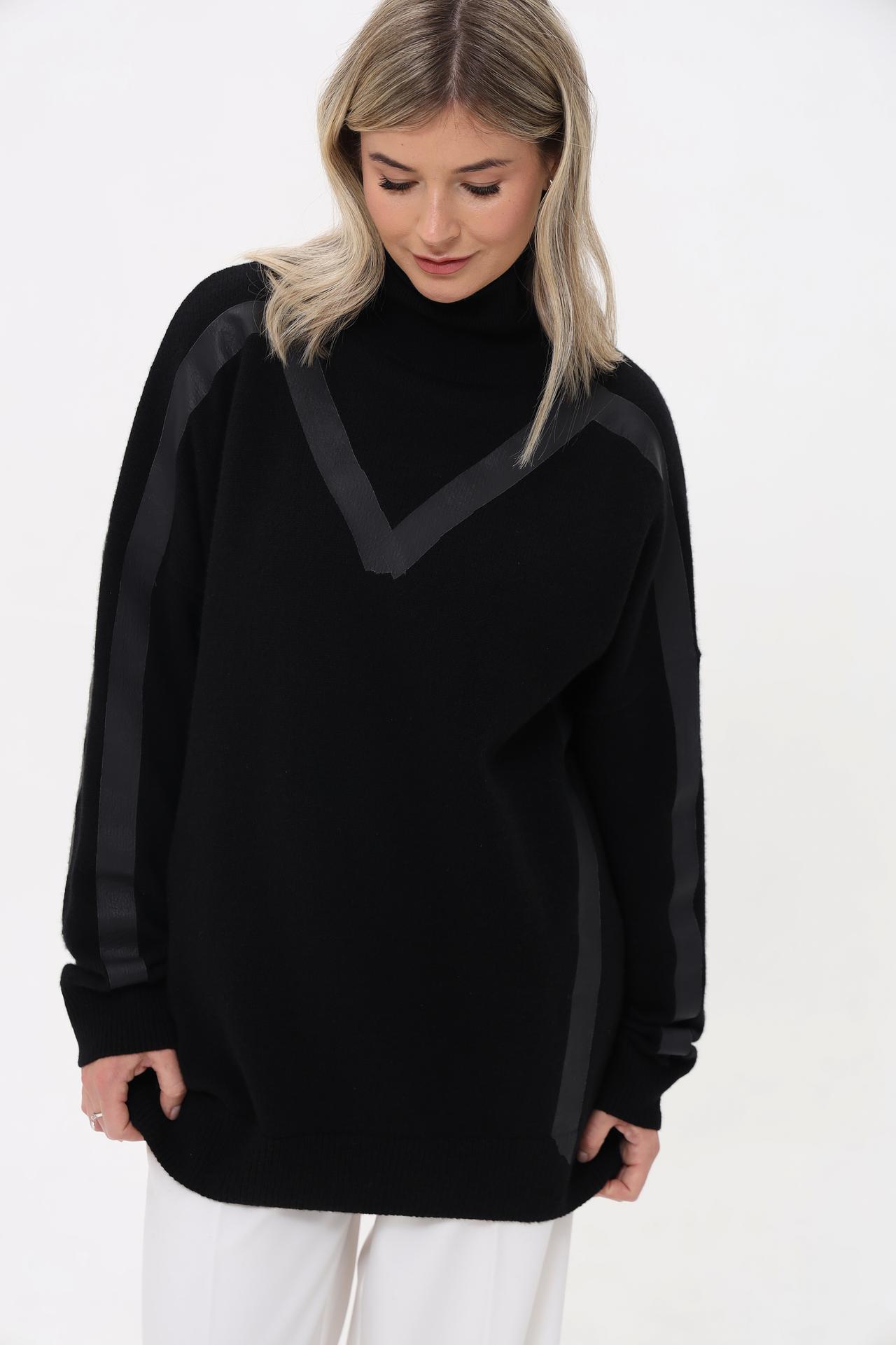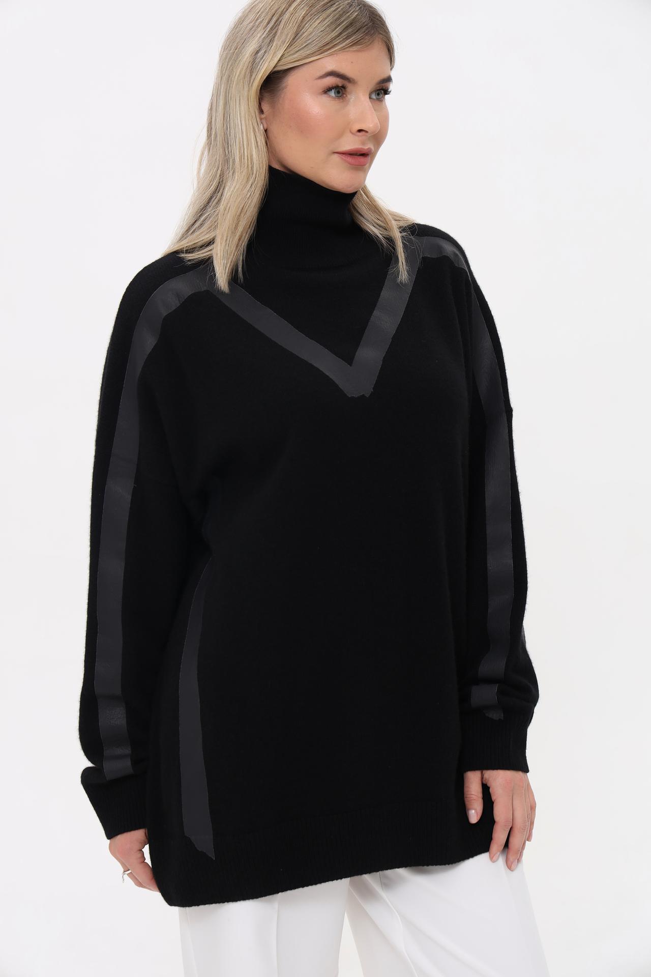 Дизайнерская отделка в виде V-образного элемента на груди и вертикальных полос вдоль рукавов и боковых швов придает изделию современный и изысканный вид. Высокий воротник-гольф добавляет образу завершенности и тепла.