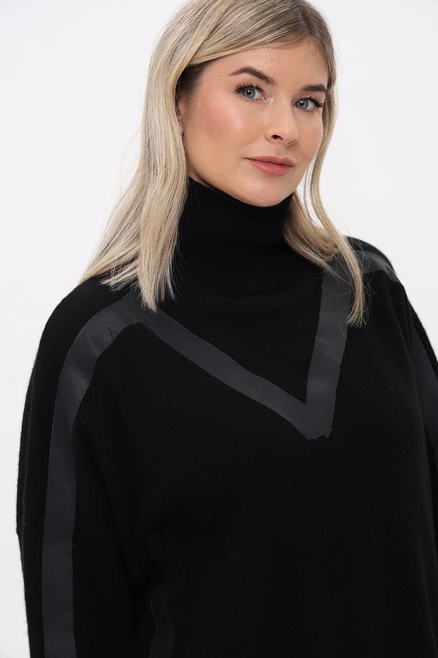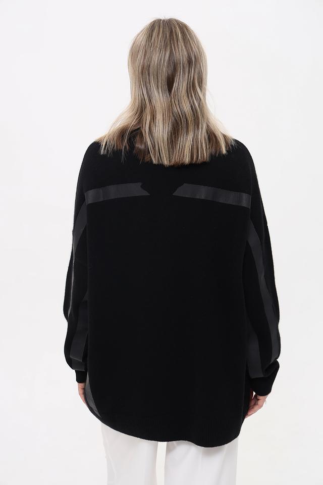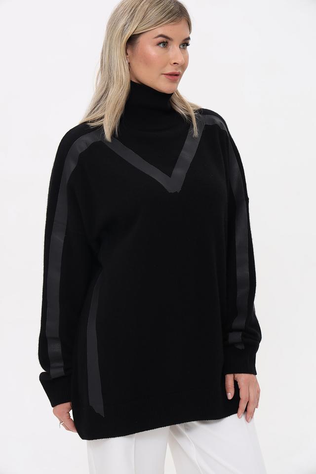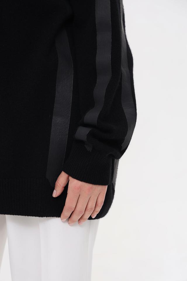 Пуловер имеет классический чёрный цвет и свободный крой оверсайз, что делает его универсальным для создания различных образов. Высокий воротник добавляет элегантности, а контрастные полосы на рукавах и плечах придают изделию современный вид.