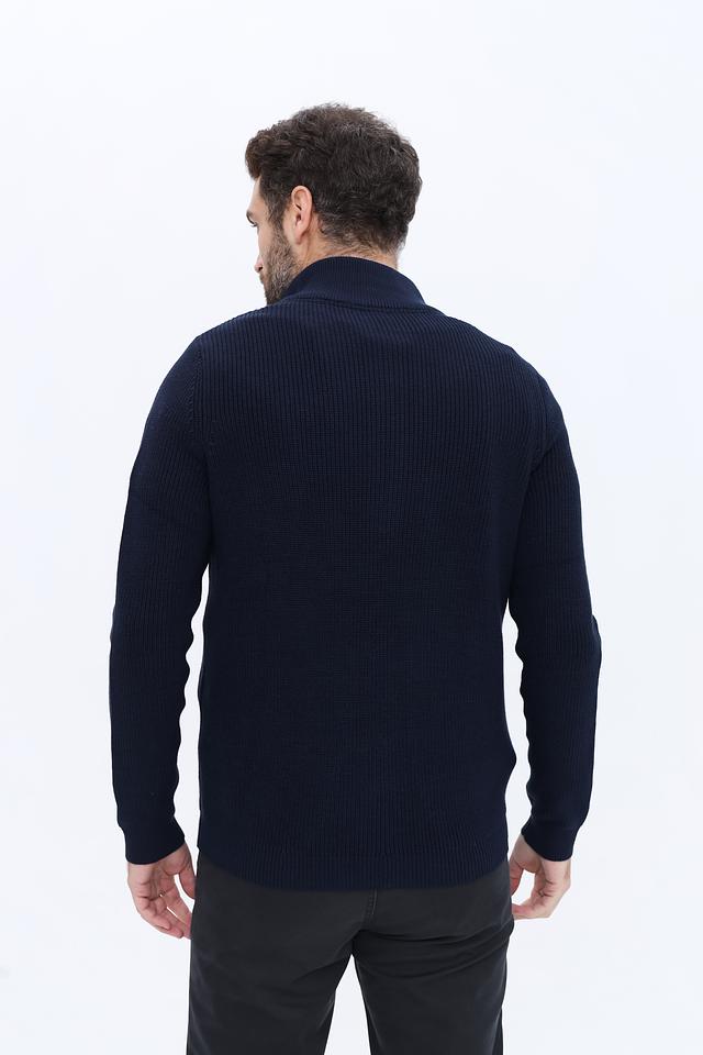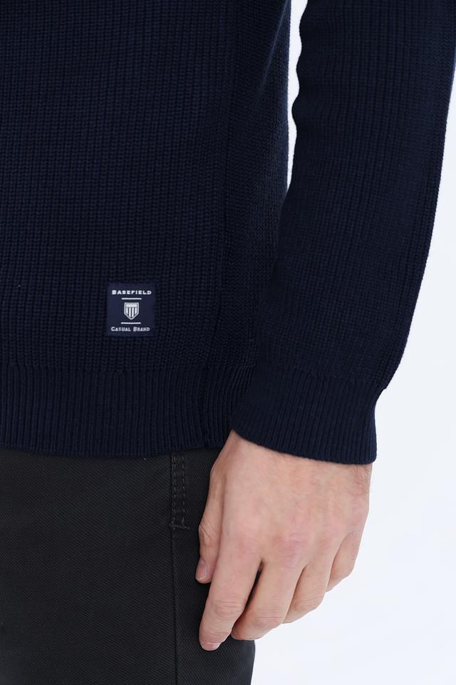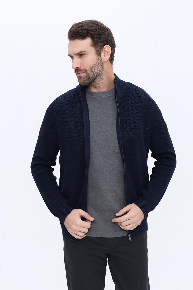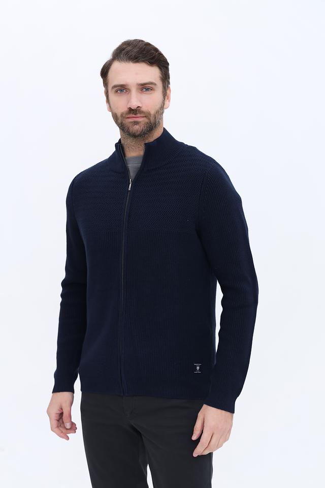 Мужской кардиган Basefield тёмно-синего цвета с застёжкой на молнии и текстурной вязкой. Модель выполнена из мягкого и приятного к телу сочетания хлопка и полиакрила, обеспечивая комфорт и удобство в носке. Состав: хлопок 60%, полиакрил 40%