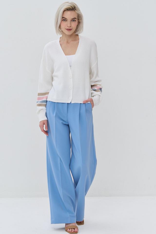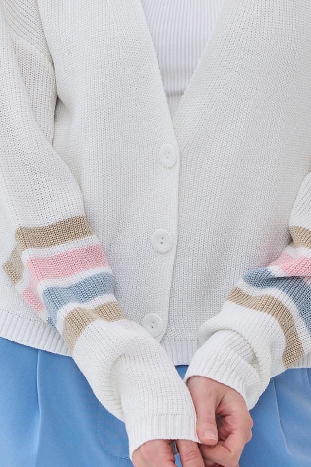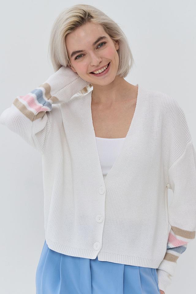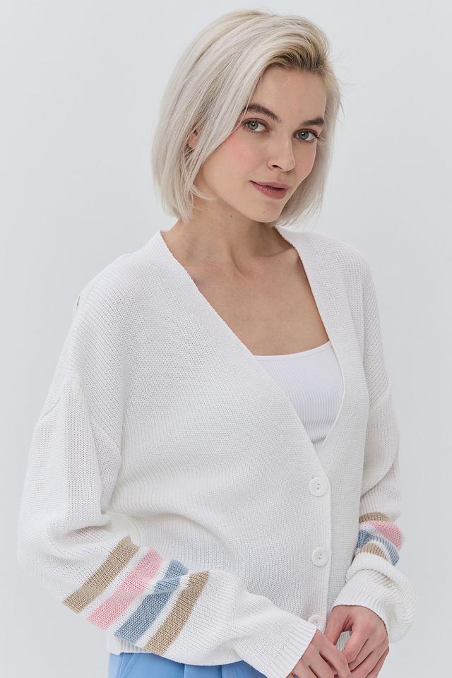 Белый кардиган BE YOU с полосатыми рукавами станет отличным дополнением к вашему образу. Модель выполнена из мягкого и приятного к телу трикотажа, застегивается на пуговицы и имеет свободный крой. Состав: хлопок 50%, пан 50%