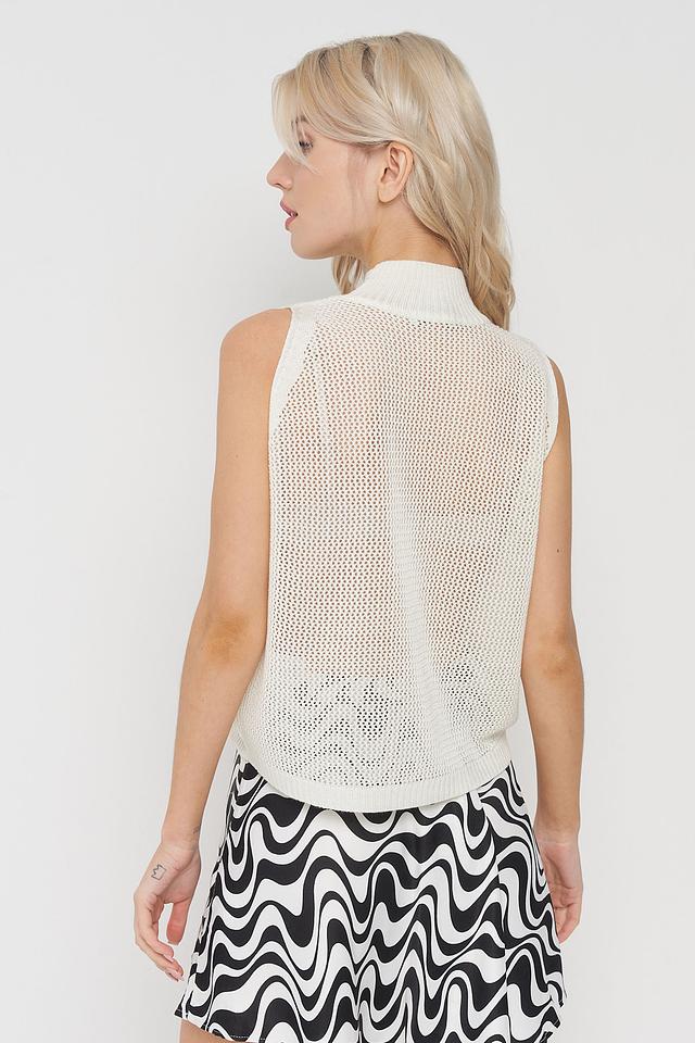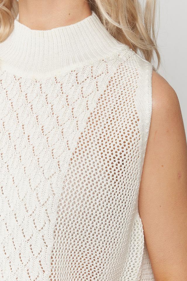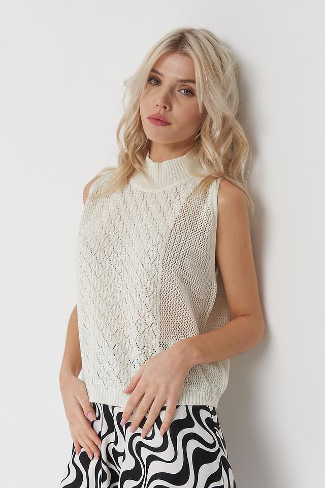 Белый жилет от BE YOU выполнен из лёгкого вязаного полотна с ажурным узором. Модель имеет высокий воротник-стойку и свободный крой, идеально подходит для создания многослойных образов. Состав: