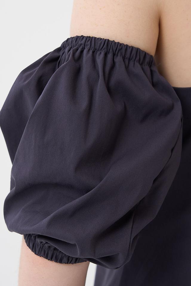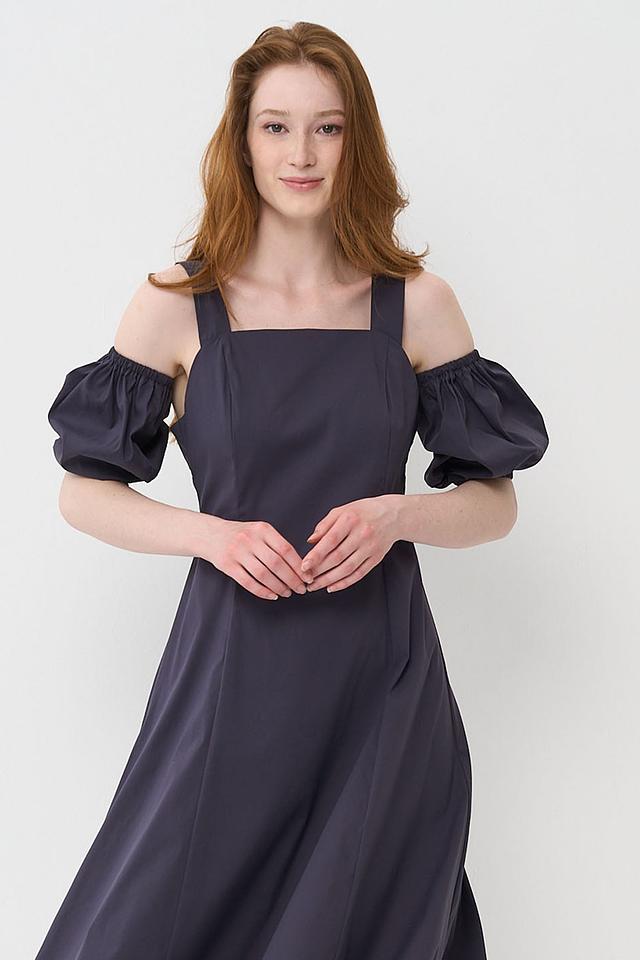 Модель выполнена с квадратным вырезом и тонкими бретелями, что придаёт ей изящность и женственность. Расклешенная юбка создает лёгкий и воздушный силуэт. На последних фотографиях платье представлено с объемными рукавами-фонариками, которые можно прикрепить к бретелям, трансформируя образ.