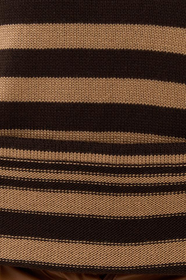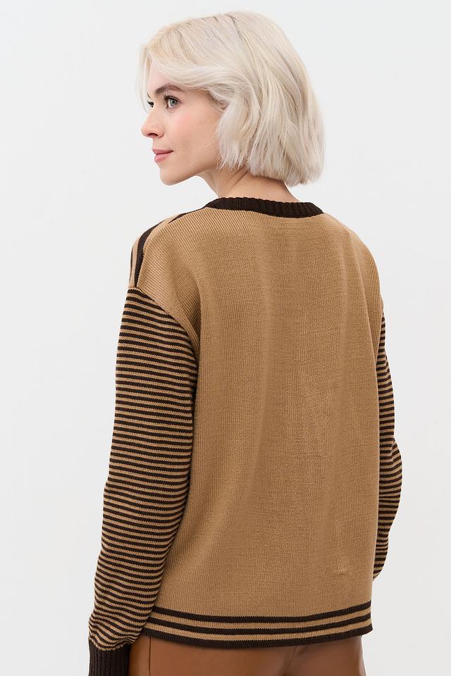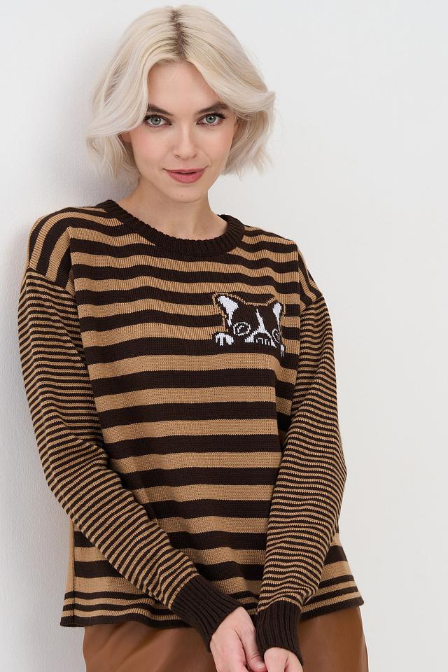 Этот стильный джемпер от BE YOU выполнен в полоску коричневых оттенков и украшен очаровательным принтом с изображением котиков. Модель имеет круглый вырез горловины и длинные рукава, что делает его универсальным для различных образов.