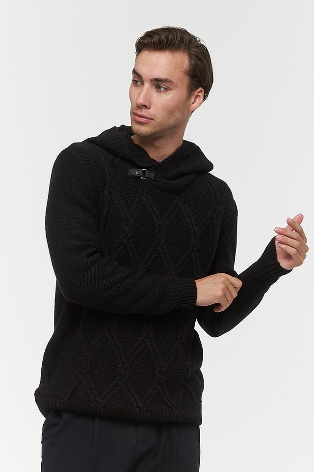 Мужской джемпер от BE YOU выполнен в классическом чёрном цвете. Модель имеет капюшон и застёжку на пуговицы в верхней части. Передняя часть джемпера украшена рельефным узором в виде ромбов, придающим изделию объём и текстуру.