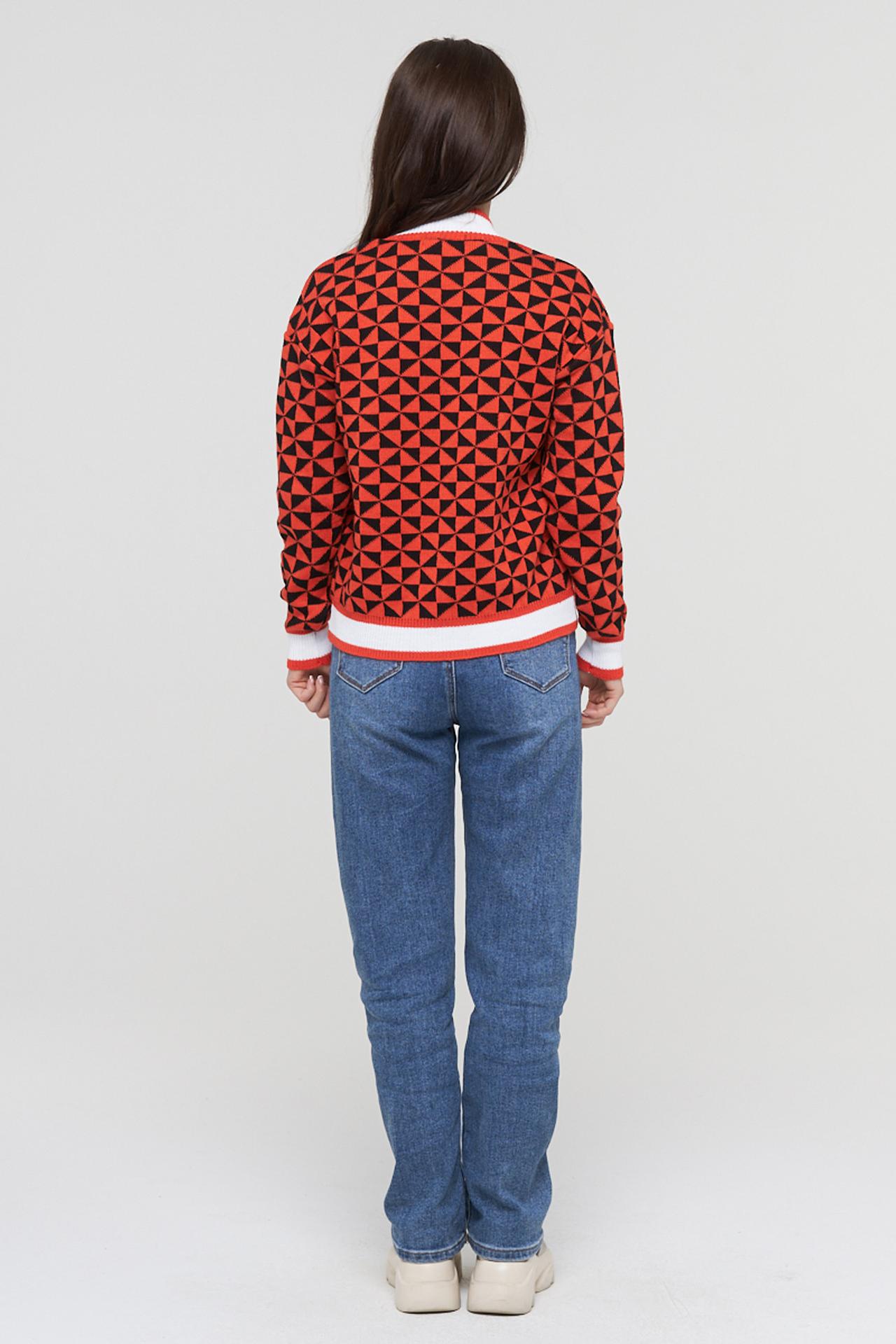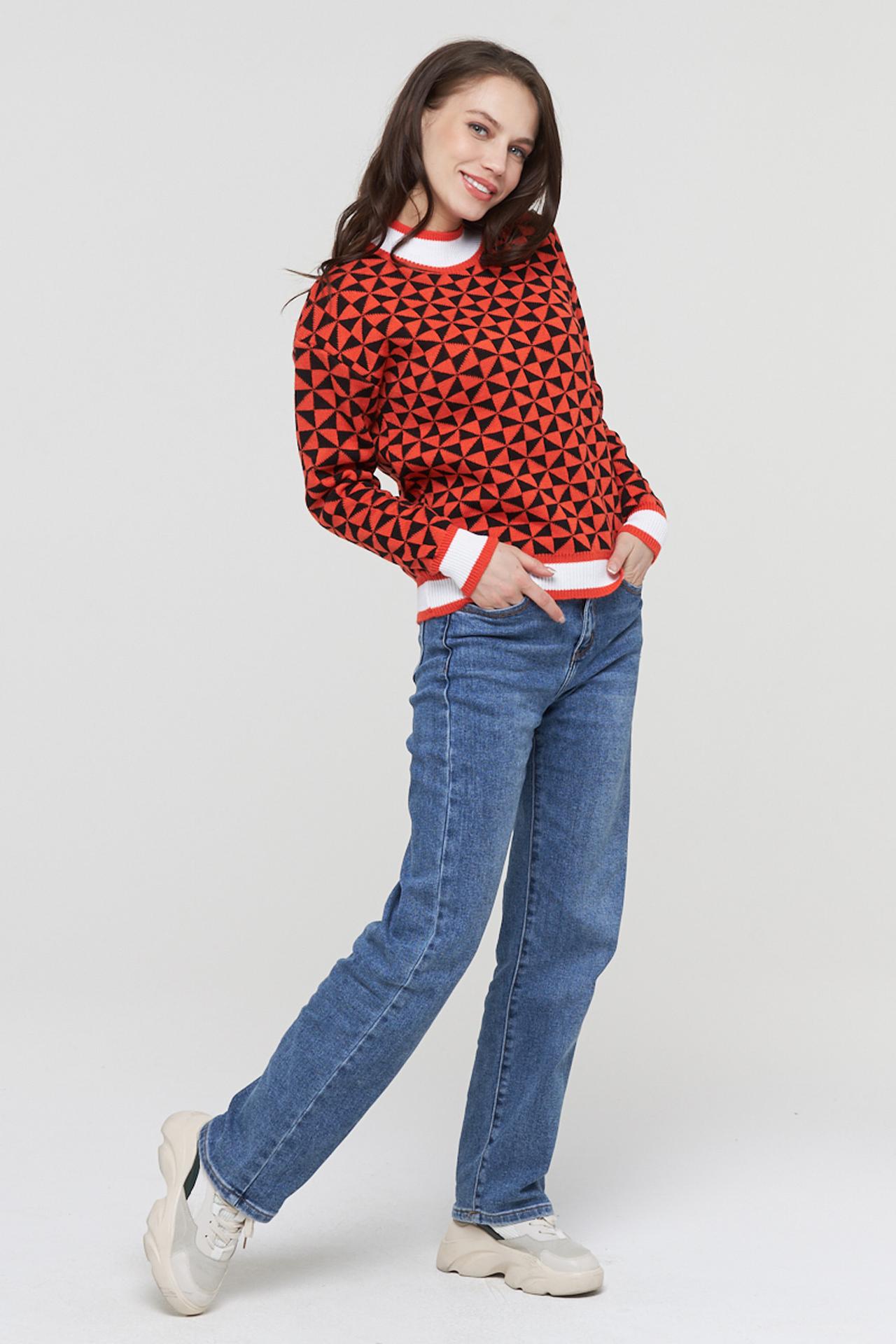 - Оригинальный дизайн: Яркий геометрический принт с треугольными элементами в красно-чёрной гамме придает джемперу уникальный и модный вид. Контрастные белые и красные полосы на воротнике, манжетах и подоле дополняют стилистику.