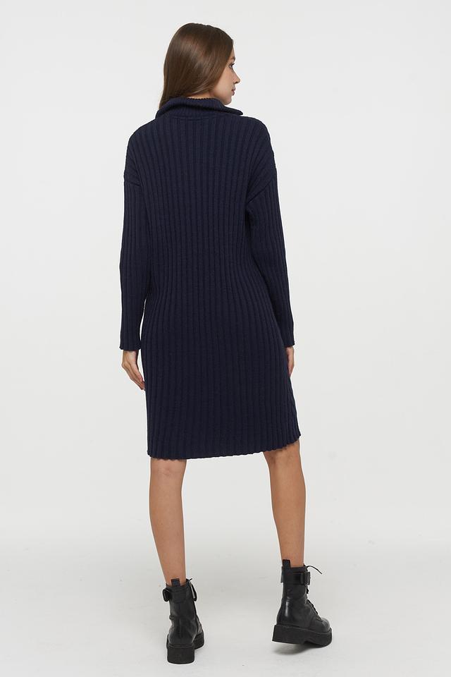 Модель отличается высоким воротником-стойкой и полупрорезной застёжкой на молнии, что добавляет ей изысканности. Длинные рукава и плотная вязка делают платье подходящим для прохладной погоды. Тёмно-синий цвет платья легко сочетается с различными аксессуарами и обувью.