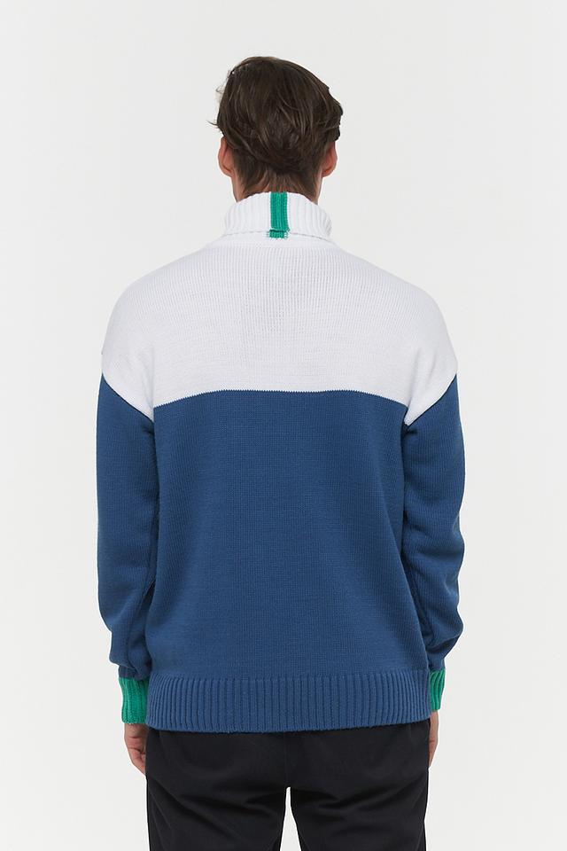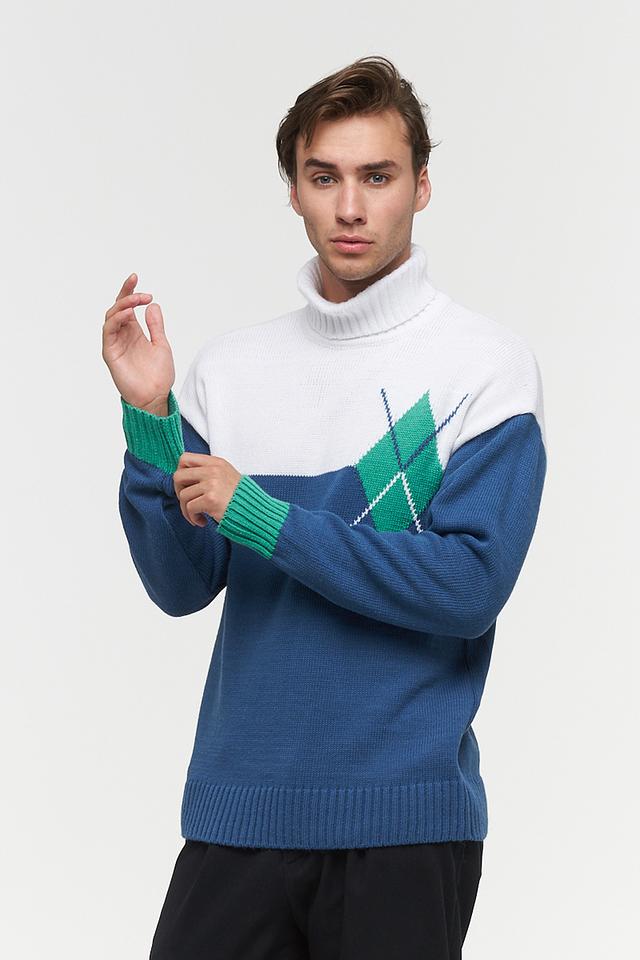 Водолазка имеет классический крой и удобную посадку по фигуре. Основной цвет – насыщенный синий, который дополнен белыми и зелёными элементами, образующими геометрический узор. Высокий воротник-стойка обеспечивает дополнительную защиту от холода.