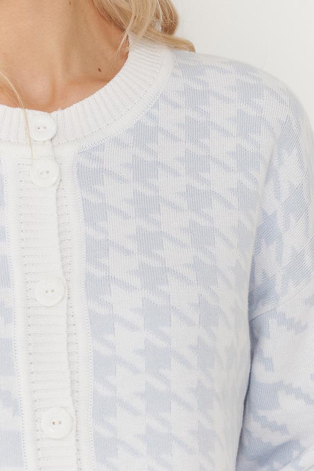 Представляем вашему вниманию кардиган от бренда BE YOU, выполненный в приятной голубой гамме с классическим узором «гусиная лапка». Эта модель станет стильным акцентом вашего образа, добавив ему элегантности и утонченности.