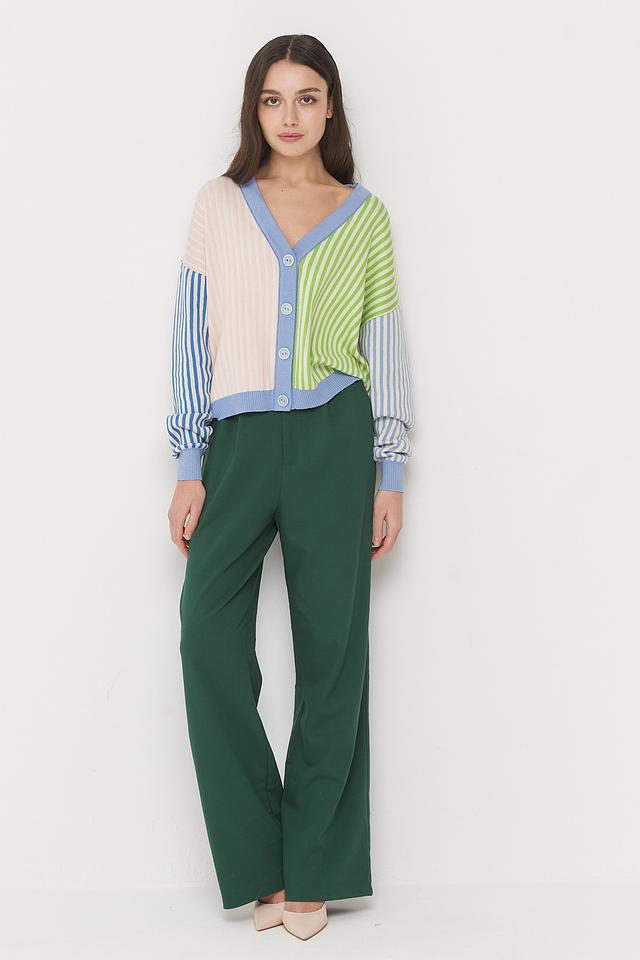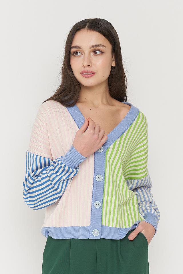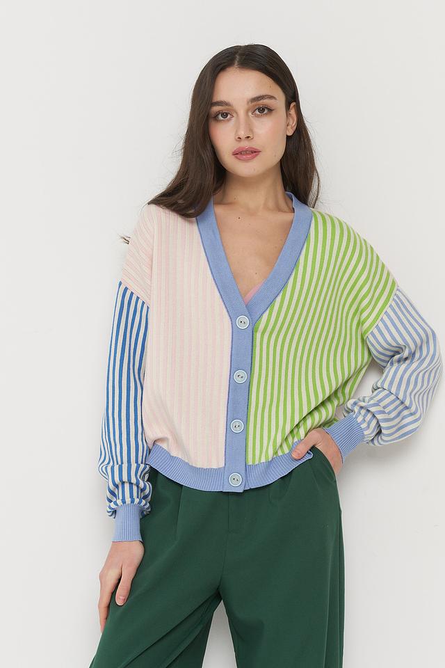 Кардиган имеет оригинальный дизайн: сочетание полосок разных цветов – голубого, зеленого и розового – создает неповторимый и запоминающийся вид. V-образный вырез подчеркивает линию шеи, а застежка на пуговицы позволяет регулировать степень открытости.