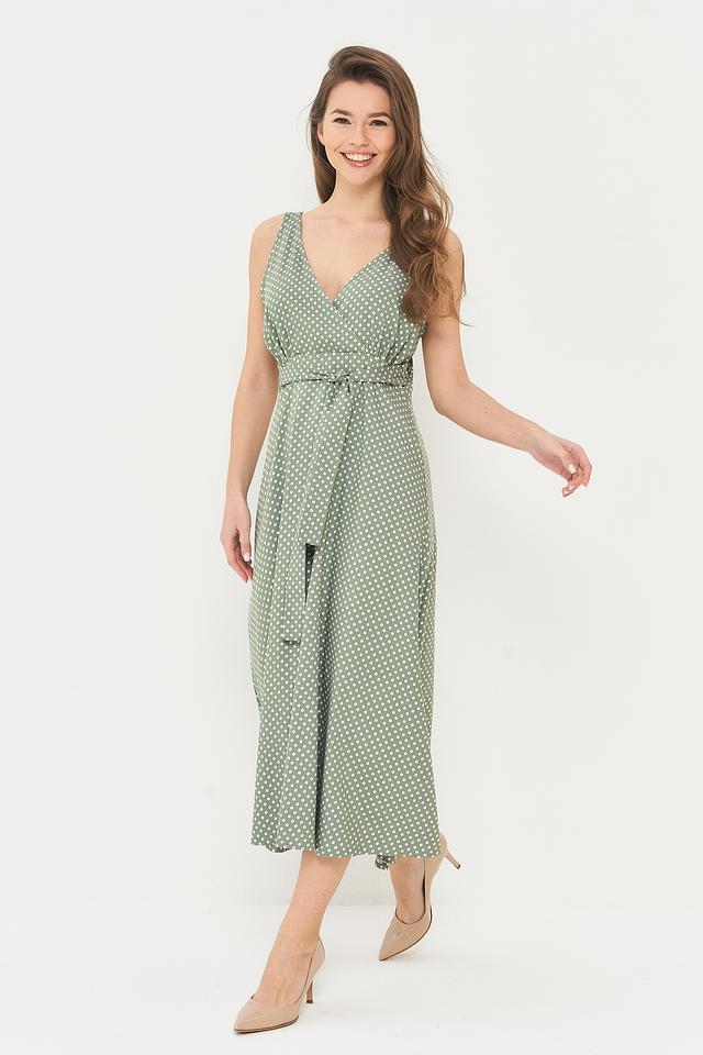 Длинное платье BE YOU зеленого цвета с мелким белым горошком – идеальный выбор для создания легкого и романтичного образа. Платье имеет V-образный вырез, тонкие бретели и акцентный пояс, подчеркивающий талию. Состав: