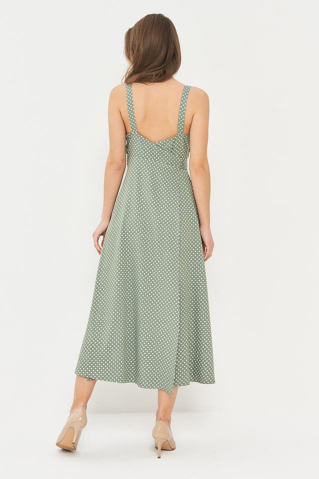 Это длинное платье от бренда BE YOU выполнено в нежном зеленом цвете и украшено мелким белым горошком, создавая свежий и женственный образ.