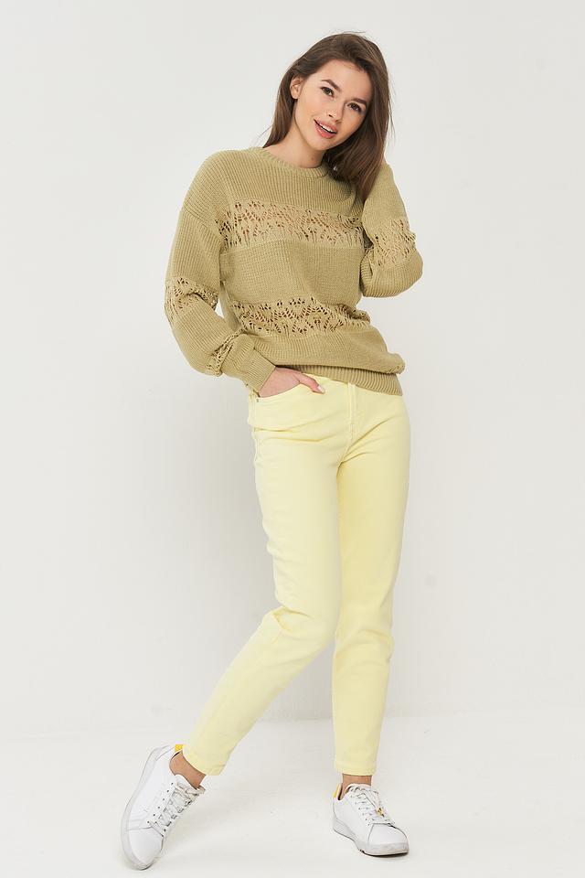 Особенностью модели является ажурный узор на лицевой стороне и рукавах, который добавляет ей оригинальности. Джемпер имеет круглый вырез горловины и длинные рукава.