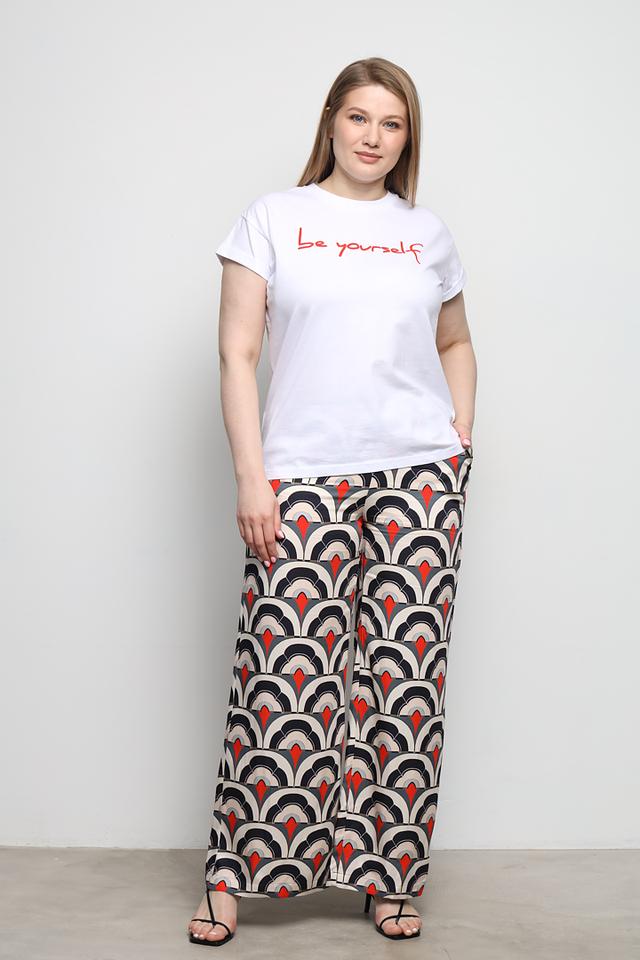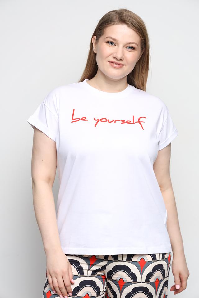 Футболка имеет прямой крой, который подходит для любой фигуры. На передней части футболки расположена яркая красная надпись "be yourself", выполненная стильным шрифтом. Это делает футболку не только удобной, но и выразительной.