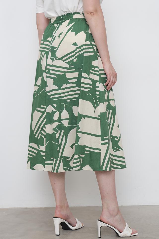 Юбка имеет длину миди и свободный крой, который не сковывает движений. Эластичный пояс с кулиской обеспечивает надежную посадку по фигуре. Главная особенность этой модели – яркий и оригинальный принт с изображением листьев и цветов в зеленых и бежевых тонах.