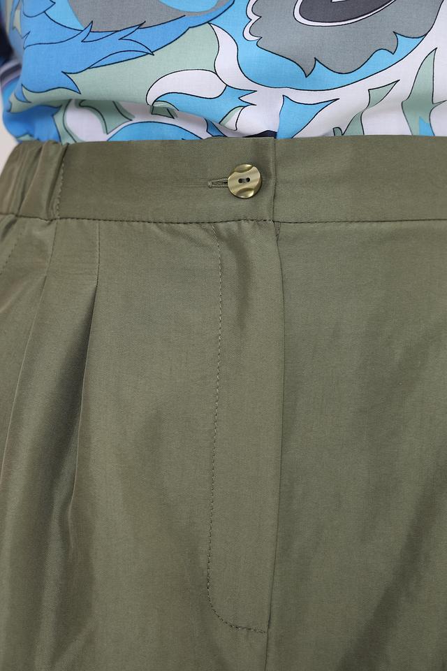 Шорты имеют высокую посадку и свободный крой, что обеспечивает максимальный комфорт в жаркую погоду. Декоративные складки на передней части добавляют изысканности и визуально вытягивают силуэт. Застежка на пуговицу и молнию.