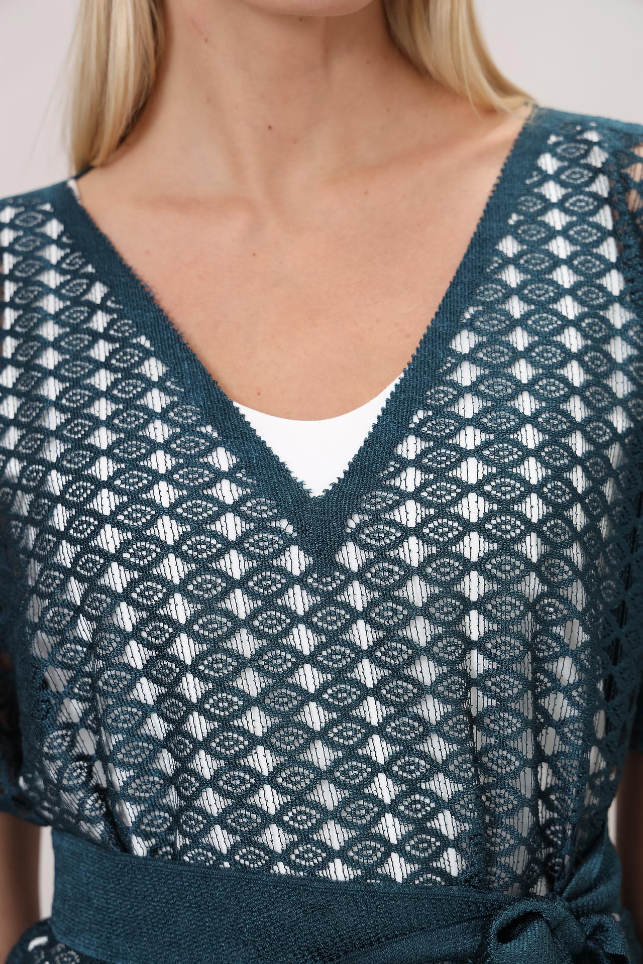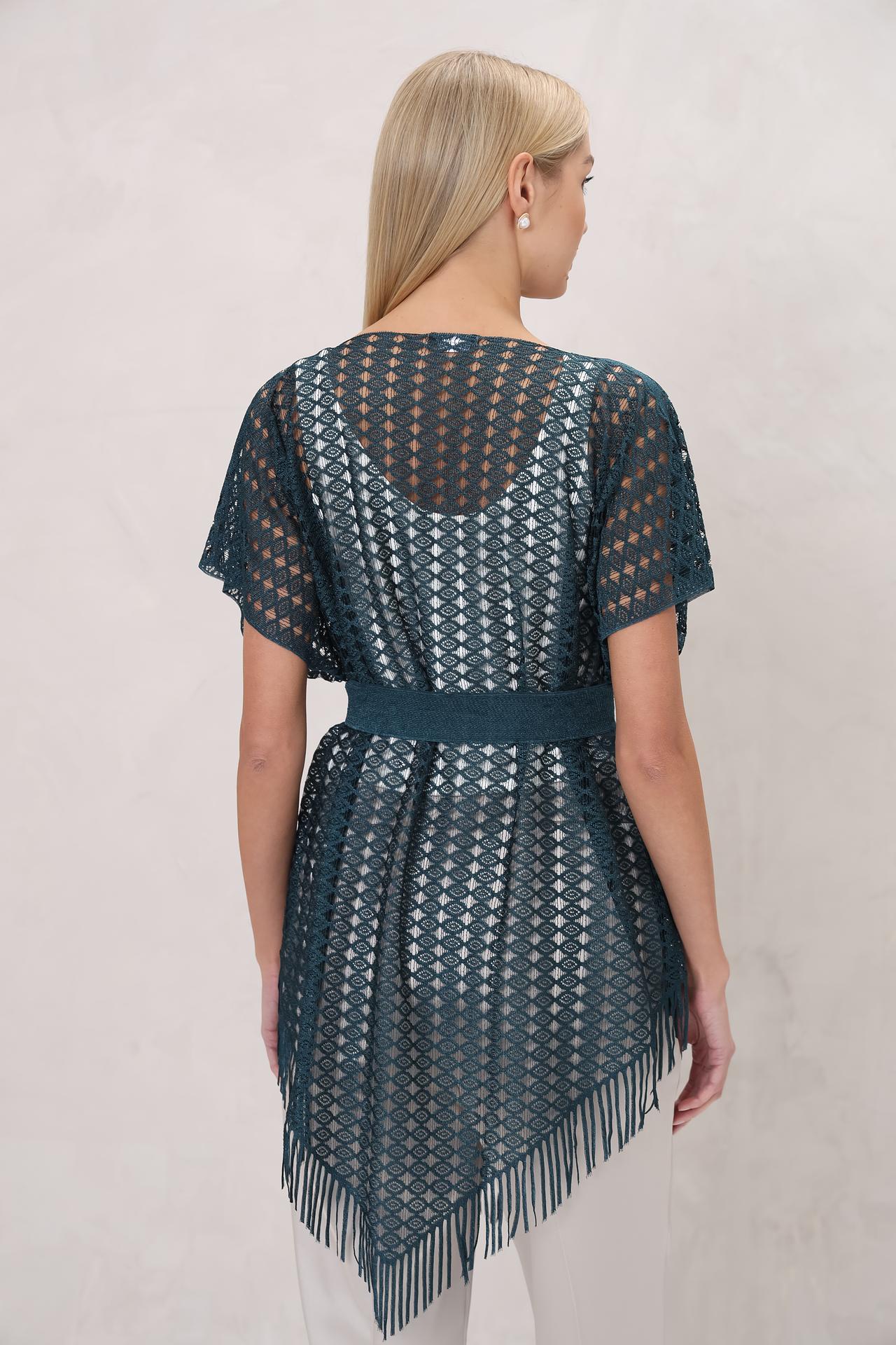 Эта женская блуза отлично подойдет как для повседневной носки, так и для особых случаев. Легкая ткань с ажурным узором и V-образным вырезом придает ей изысканность. Дополнительный пояс акцентирует талию, а бахрома добавляет образу игривости и динамики.