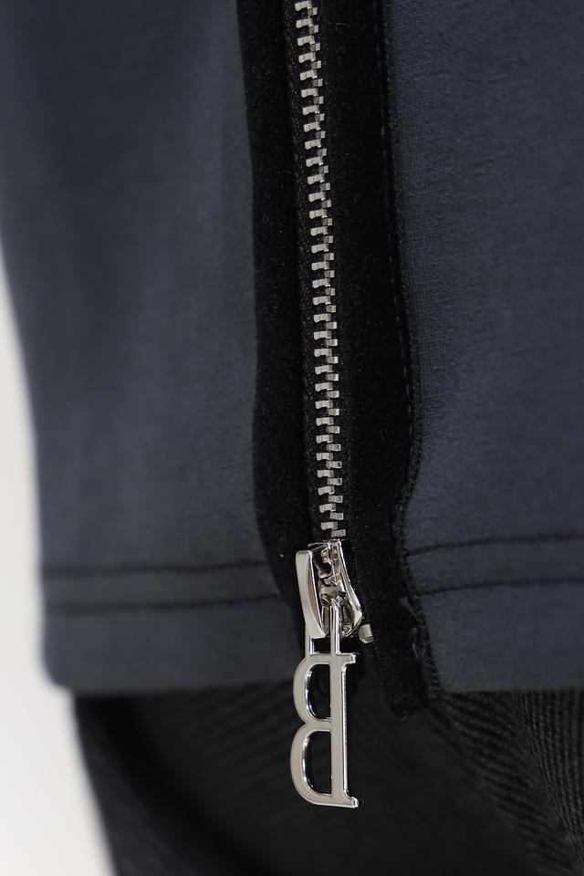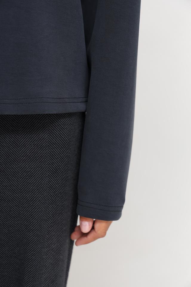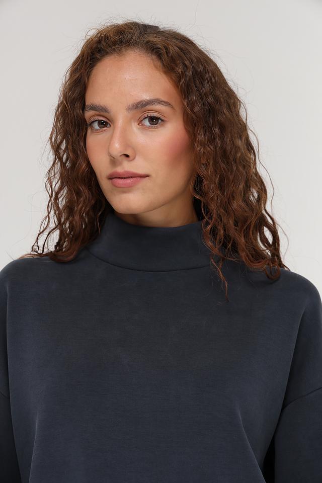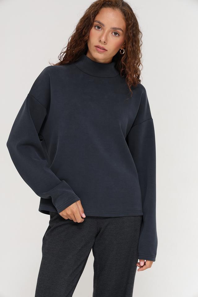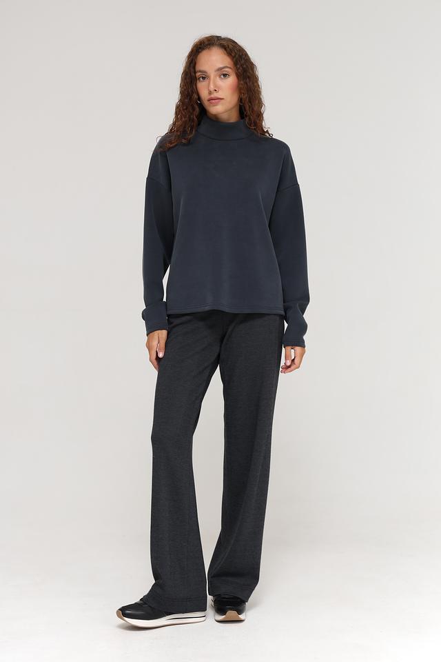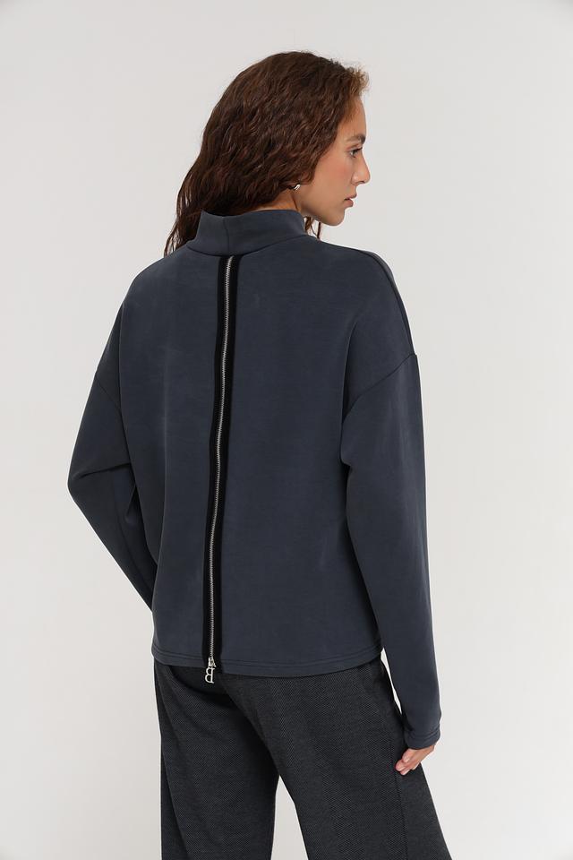 Пуловер имеет графитовый цвет и высокий воротник, который добавляет элегантности образу. Оригинальной деталью является молния на спине, которая не только украшает изделие, но и обеспечивает дополнительное удобство при надевании и снятии.