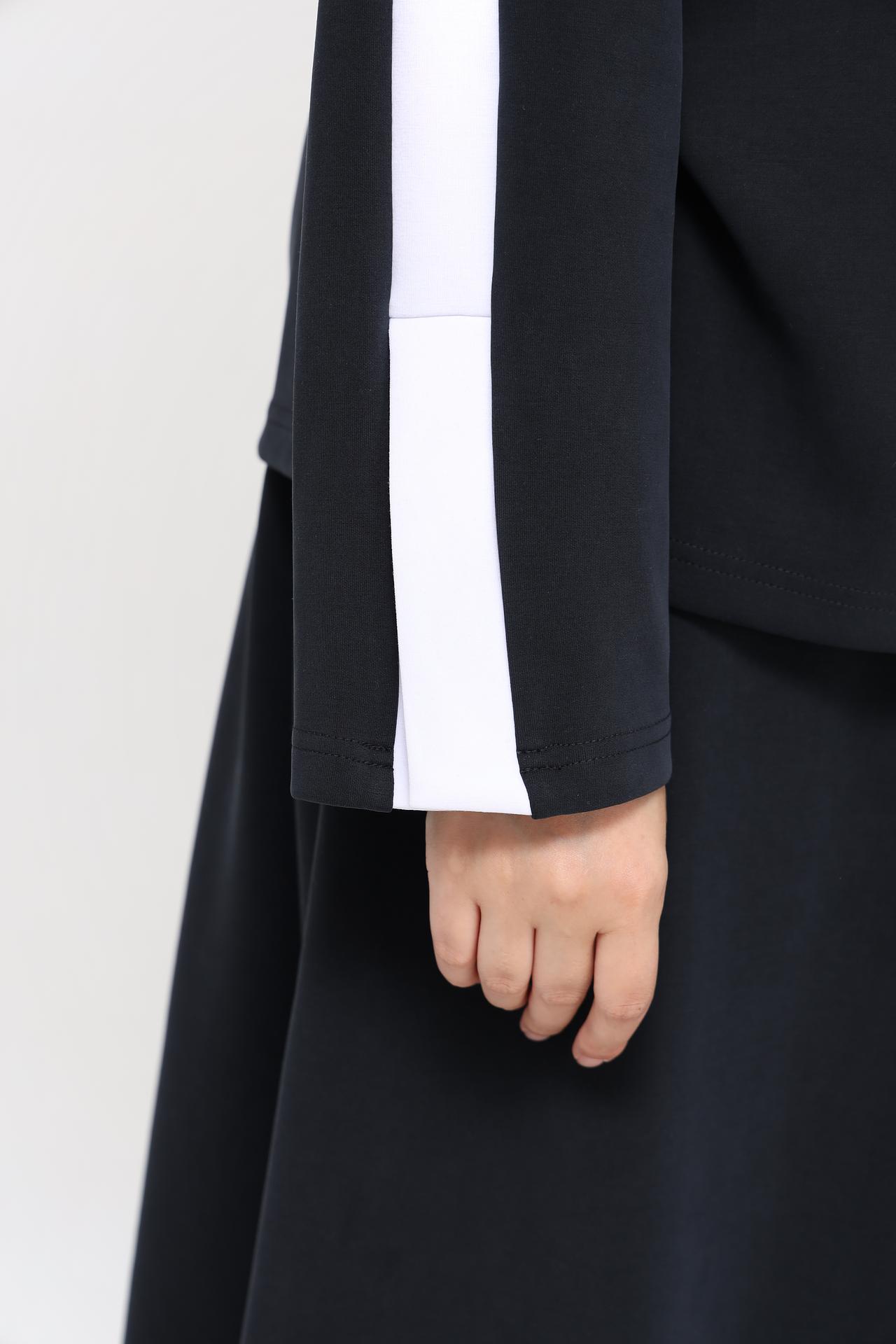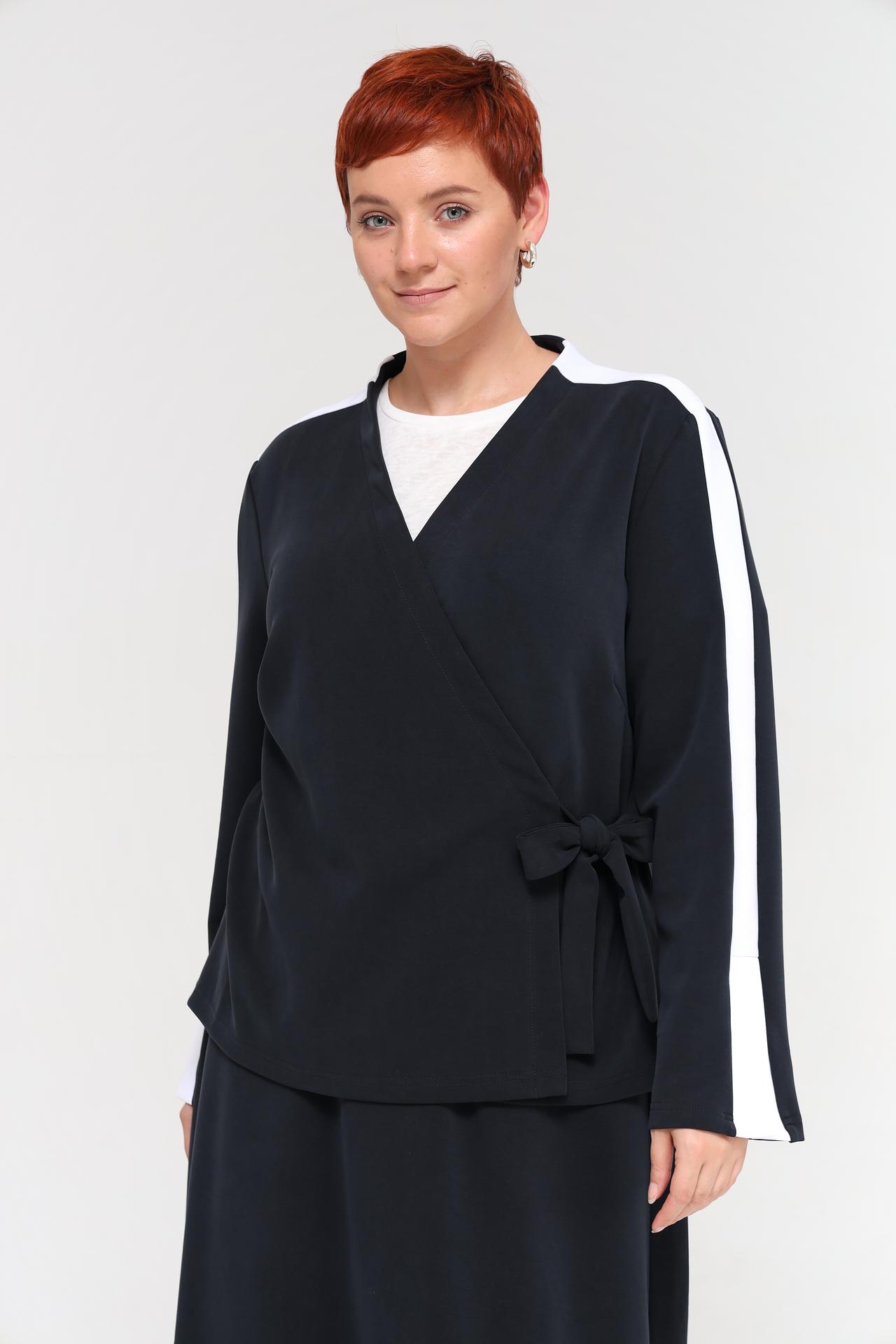 - Дизайн: Оригинальный крой с запахом и элегантная белая отделка по плечам и рукавам делают эту модель по-настоящему уникальной. Универсальный темно-синий цвет легко сочетается с другими элементами гардероба.