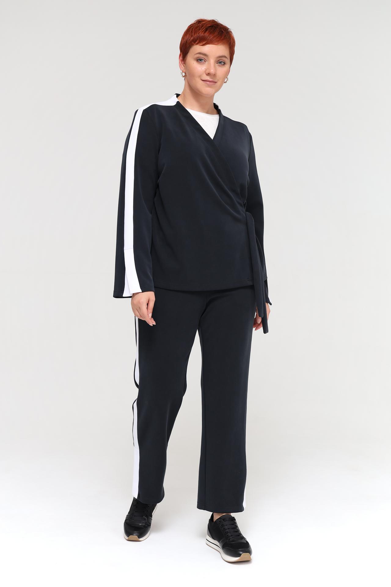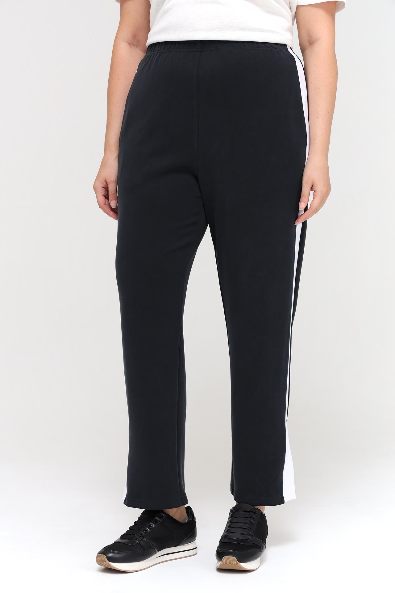 - Дизайн: Прямой крой брюк с эластичным поясом и контрастными белыми лампасами по боковым швам. Лаконичный дизайн подчеркивает элегантность и делает модель универсальной.