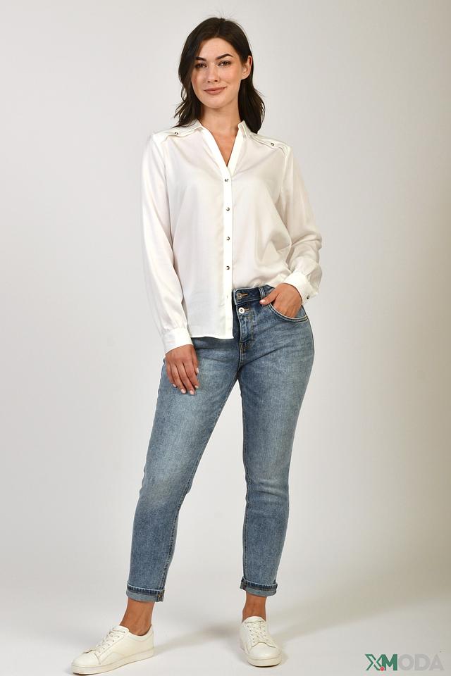 Передняя планка застегивается на пуговицы в тон изделия. Воротник выполнен в классическом стиле. На плечах присутствуют небольшие декоративные элементы, добавляющие блузе изысканности.