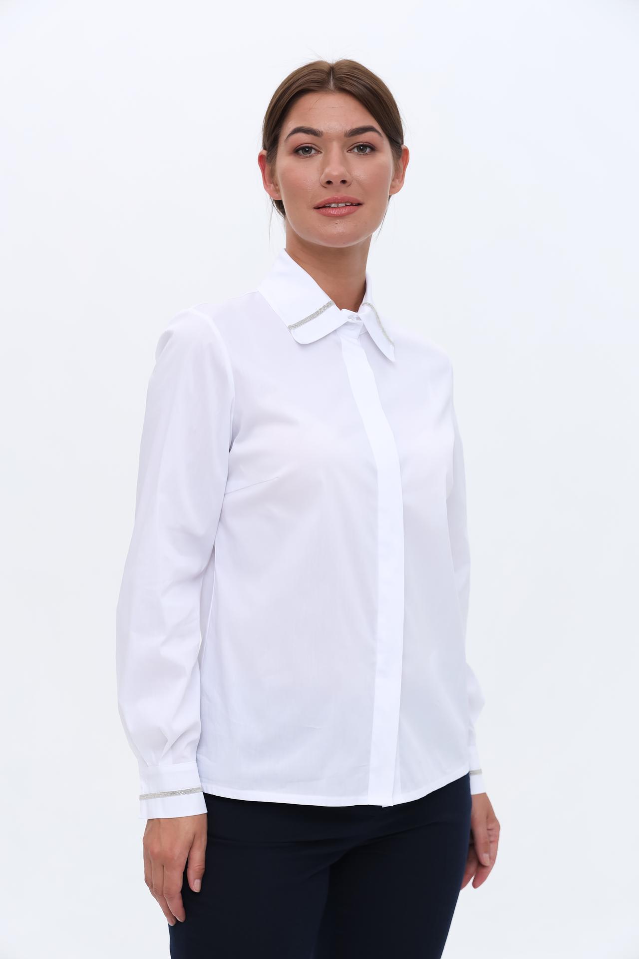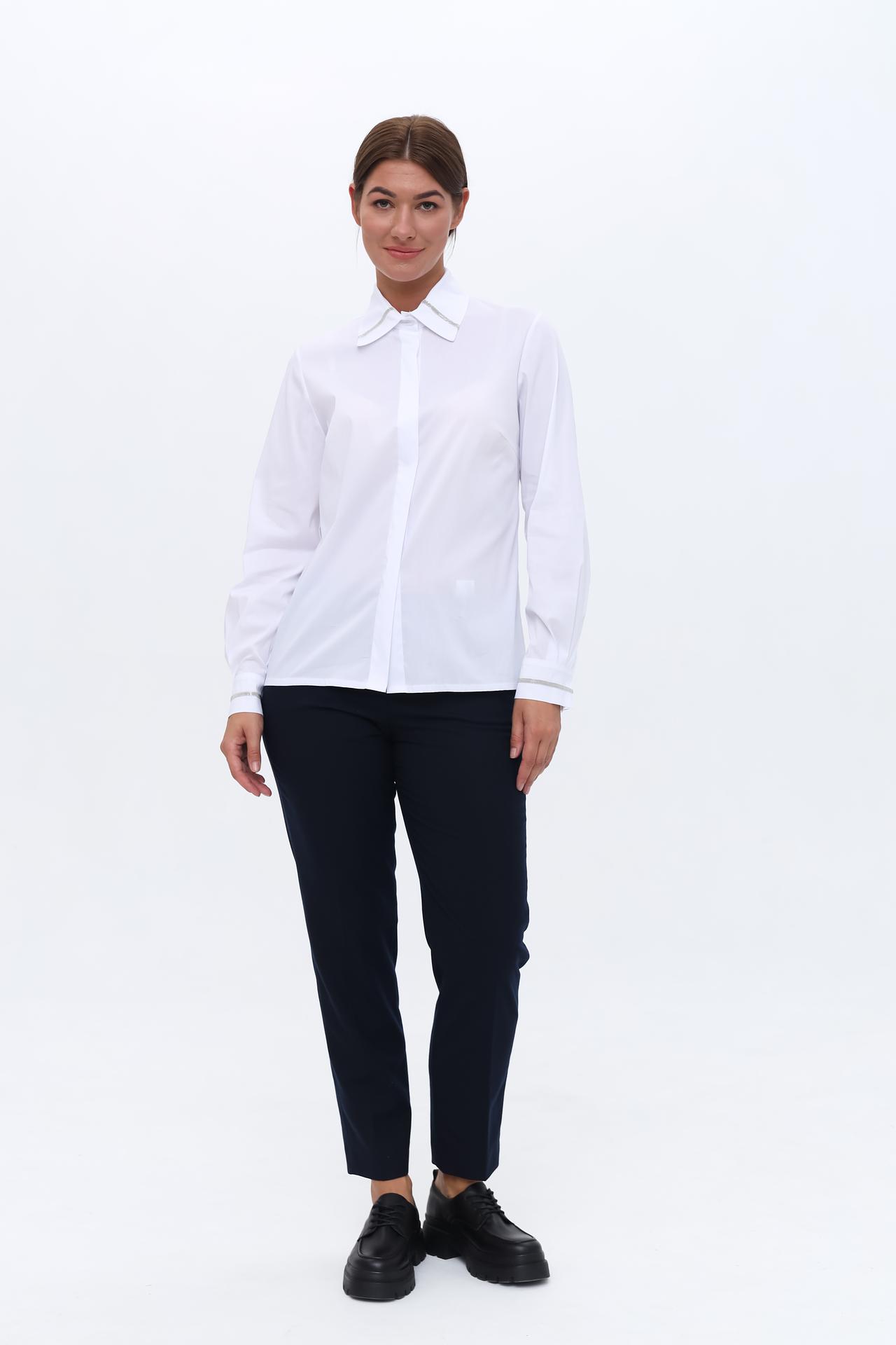 Дизайн блузки сочетает в себе классический крой и изысканные детали. Длинный рукав, воротник и манжеты украшены серебристой отделкой, что добавляет изделию нотку гламура. Блузка идеально подходит как для офиса, так и для вечерних мероприятий.